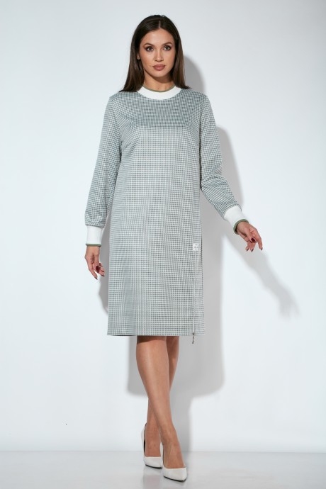 Платье женское, прямого силуэта с длинным втачным рукавом. Низ рукава на манжете. По переду платья нагрудные вытачки. Вырез горловины круглой формы с подрезной бейкой. Разрез спереди, смещенный. Оформлен металлической тесьмой "молния" с текстильной подложкой. Верх разреза задекорирован нашивкой. Манжеты рукавов и бейка горловины выполнены из отделочного трикотажного полотна (кашкорсе) Спинка без особенностей.