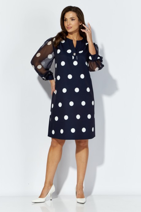 Платье женское, А силуэта, с втачным рукавом, длинной 3/4. Рукав расширенный к низу с разрезом по шву. Разрез зафиксирован на навесную петлю и отделочную пуговицу. Вырез горловины фигурной формы. Перед задекорирован вышивкой из паеток. По спинке средний шов и талевые вытачки. Застежка на потайную тесьму "молния" в среднем шве.