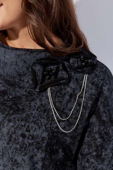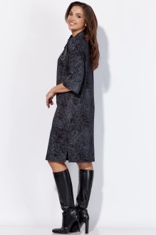 Платье женское, прямого силуэта с цельнокрайним рукавом, длиной 3/4. По переду и спинке фигурные рельефы. По переду карманы в рельефах с отделочной отстрочкой. По низу, в боковых швах, разрезы. Горловина оформлена небольшой , мягкой, цельнокрайной строчкой. Декором служит съемное украшение (цветы) с цепочкой.