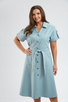 Платье в стиле «сафари» из ткани с хлопком, прилегающего силуэта, отрезное по линии талии, с цельнокроеным рукавом, центральной бортовой застежкой на петли и пуговицы, отложным воротником. Перед и спинка лифа с отрезными бочками и талиевыми вытачками. Юбка платья с накладными карманами на переде и средним швом и талиевыми вытачками по спинке. Низ рукава обработан обтачкой и патой с застежкой на петли и пуговицы.