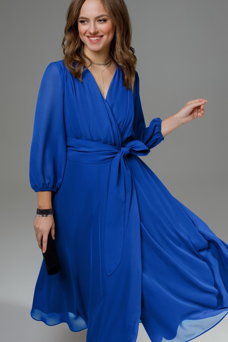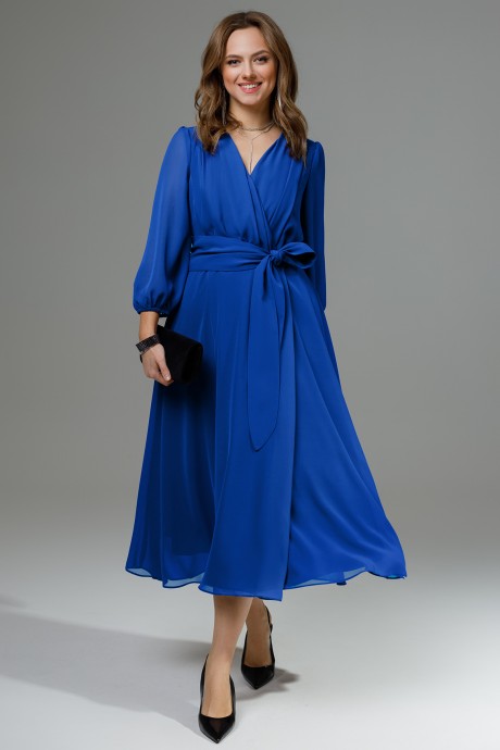 Летящее платье полуприлегающего силуэта из легкой струящейся ткани. Рукав втачной, с небольшой сборкой по окату, длиной ¾, внизу на резинке. Отрезное по талии на резинке, с v-образным вырезом горловины. С фиксированным запахом по лифу и юбке. Платье на подкладке. Есть съемный пояс.