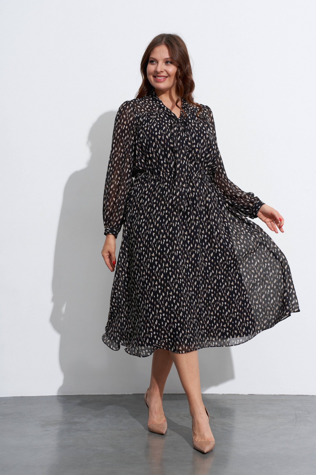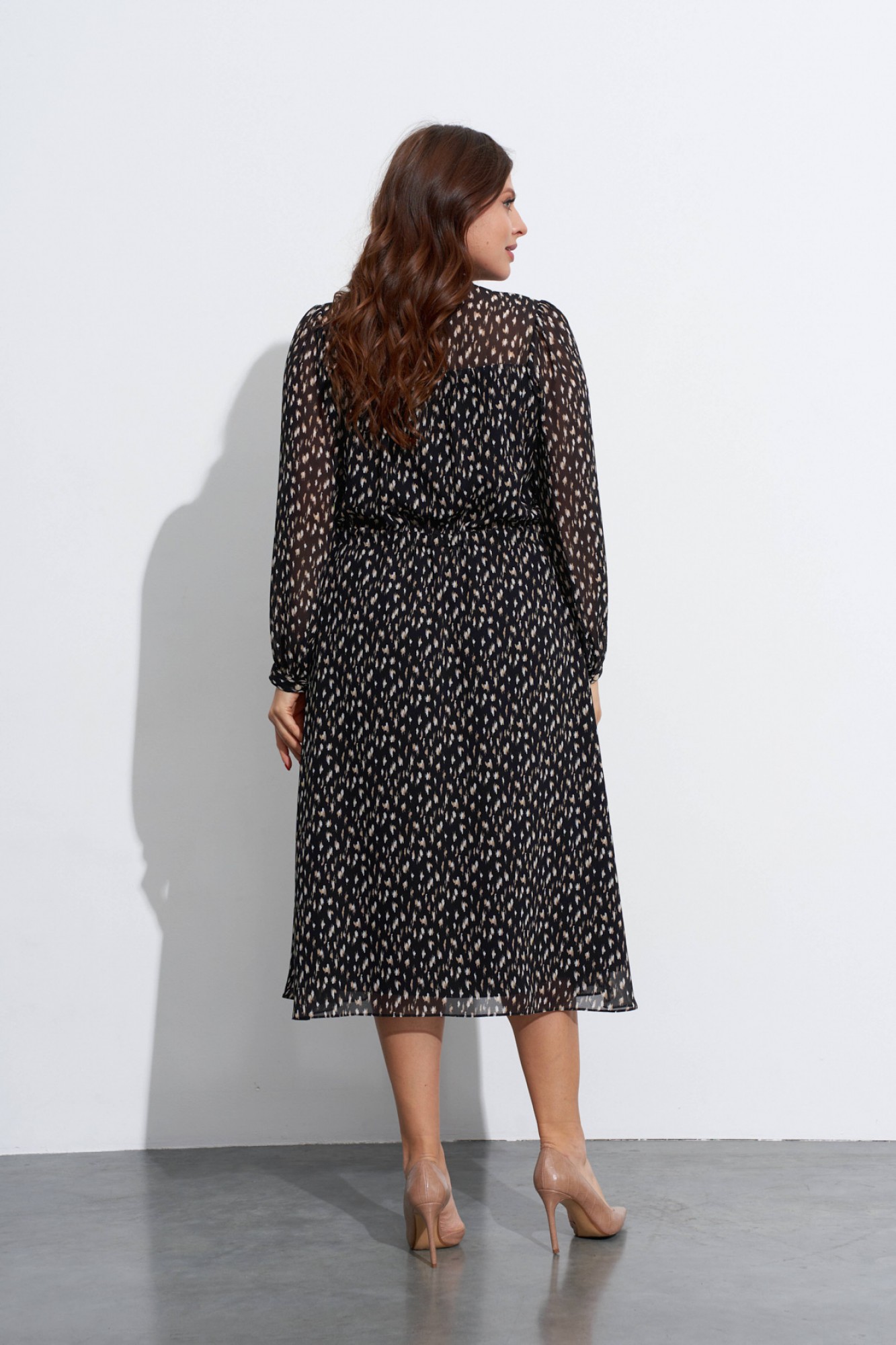 Платье из шифона с отрезным лифом и разведённым низом. Лиф переда выполнен запашным из присборенных у плеча и в талии деталей. Нижние детали платья также с запахом. Платье можно подвязывать поясом. Рукава в ¾ длины, сверху присборены и снизу собраны на эластичную тесьму. Изделие на лёгкой подкладке.