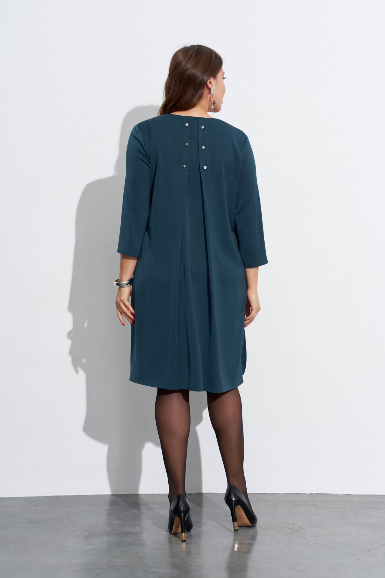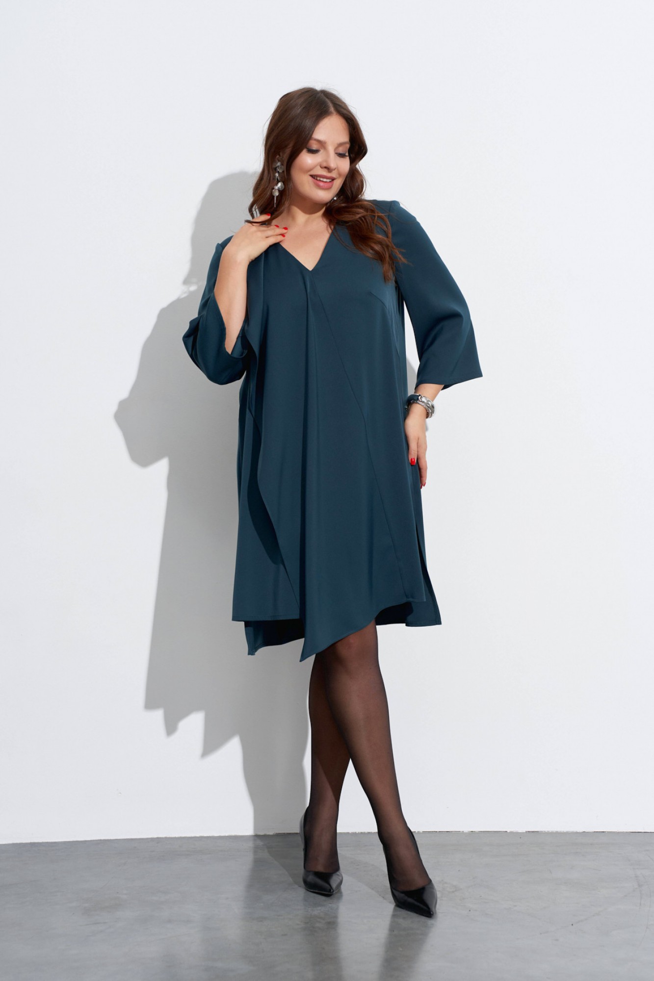 Свободное платье с небольшим расширением к низу. Горловина с V-образным вырезом. Рукава широкие, в ¾ длины. Деталь переда с нагрудными вытачками ,с косым швом от горловины до низа и с отлетной деталью. В боковых швах разрезы, у горловины спинки закреплены две складки, декорированные пришивной фурнитурой.