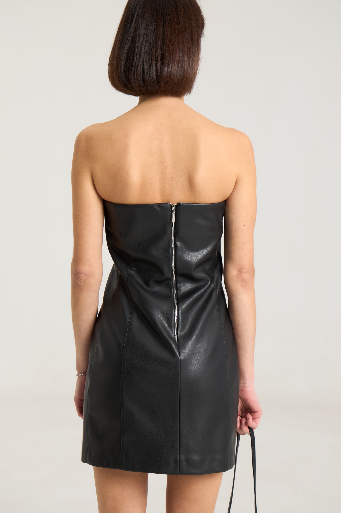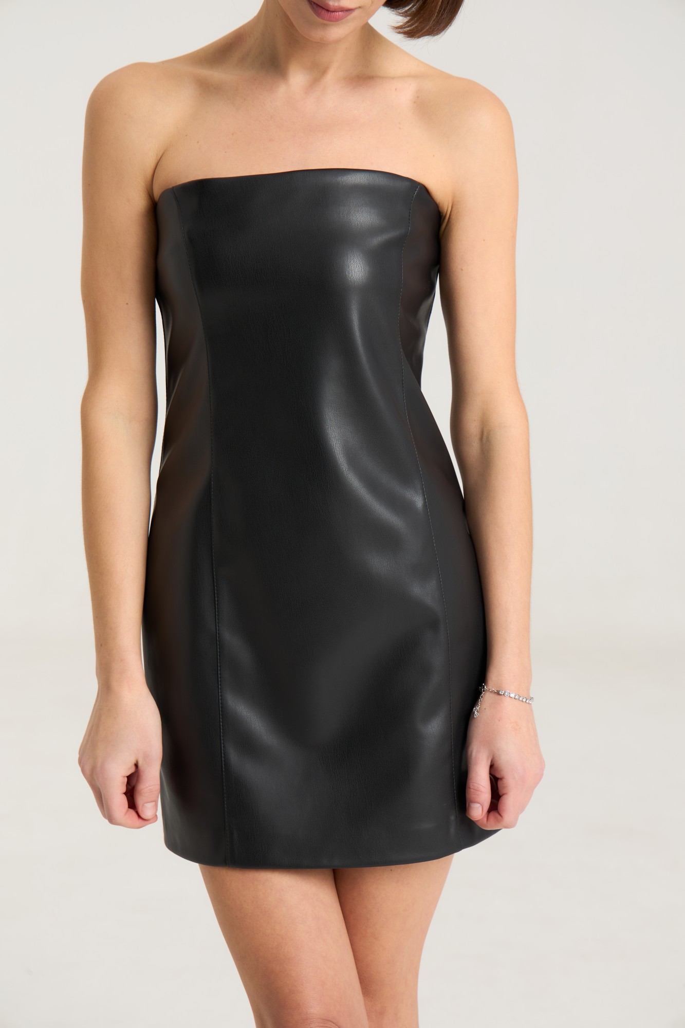 Платье-бандо выполнено из лаковой экокожи шоколадного цвета. Платье прилегающего кроя, подчеркивающего силуэт. Изделие имеет боковые швы спереди и сзади, застежка на декоративную молнию по спинке в среднем шве. Платье на подкладке. Данную модель можно сочетать с балетками, мюлями, босоножками на плоской подошве или обувью на каблуке.