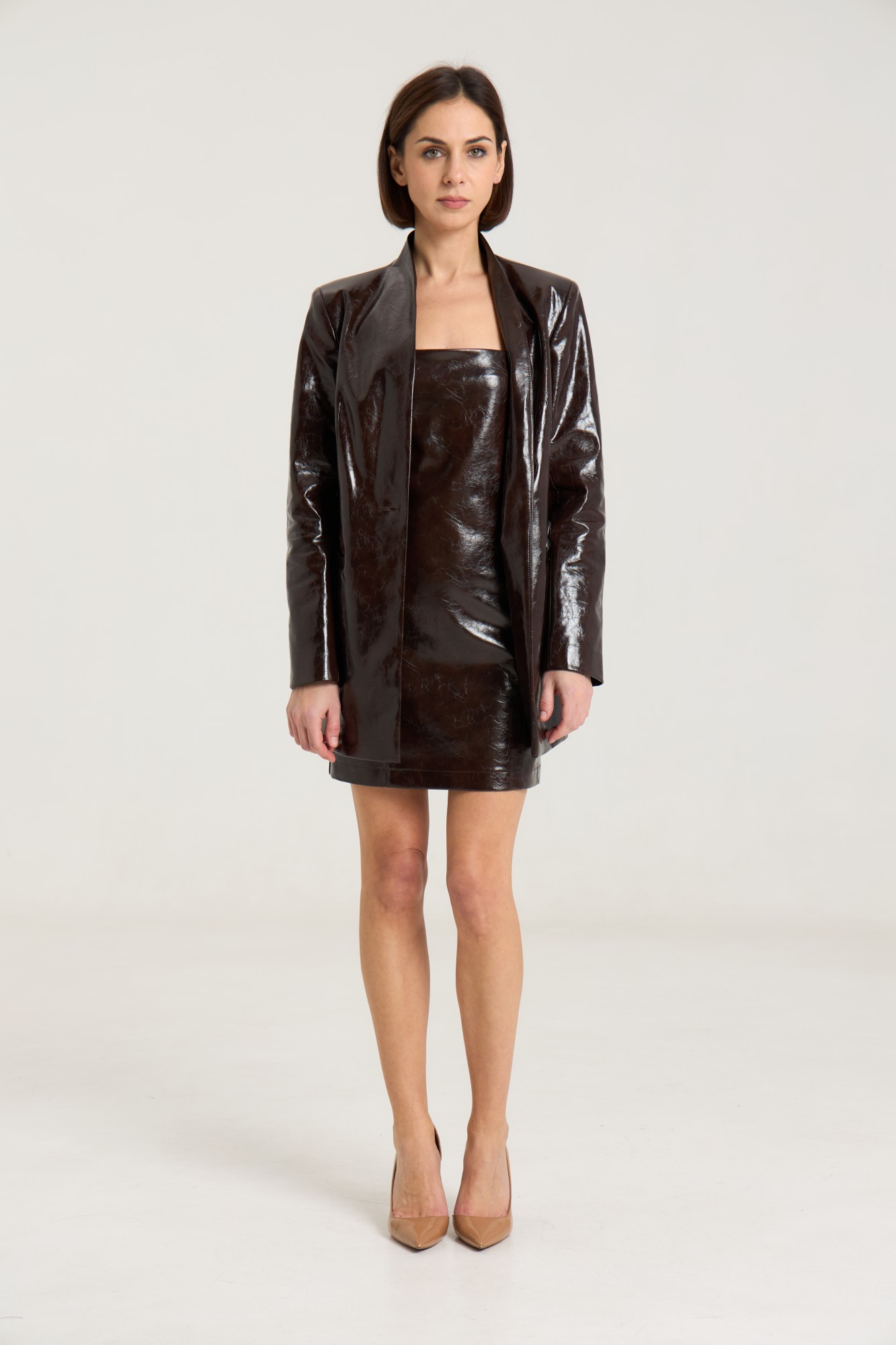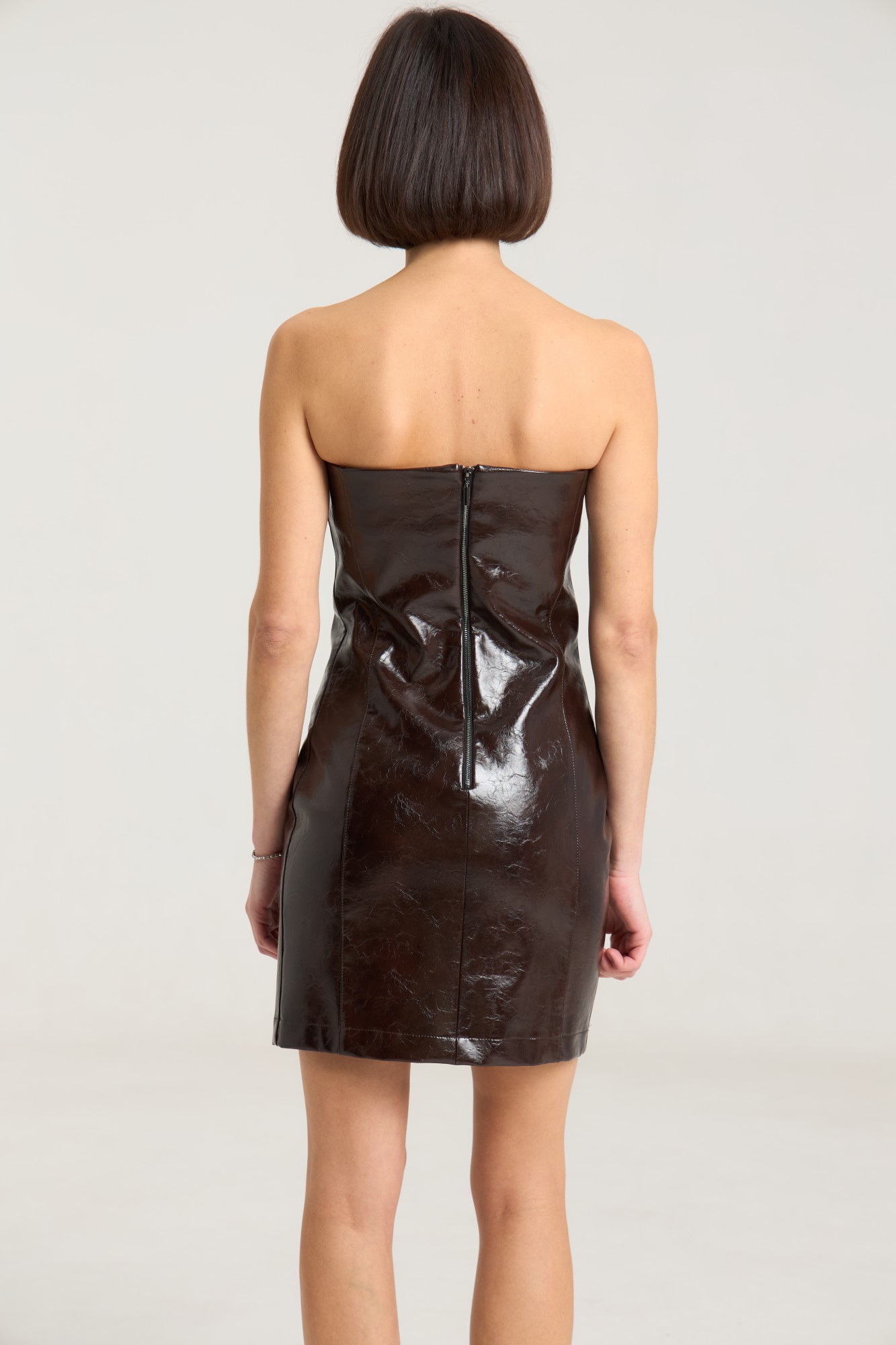 Платье-бандо выполнено из лаковой экокожи шоколадного цвета. Платье прилегающего кроя, подчеркивающего силуэт. Изделие имеет боковые швы спереди и сзади, застежка на декоративную молнию по спинке в среднем шве. Платье на подкладке. Данную модель можно сочетать с балетками, мюлями, босоножками на плоской подошве или обувью на каблуке.