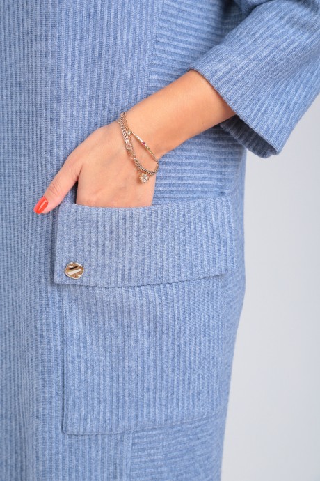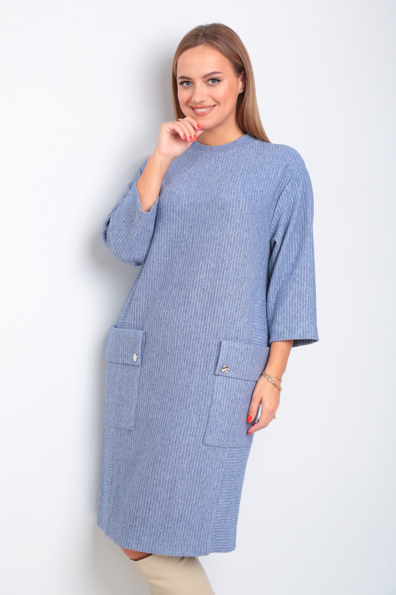 Платье прямого свободного силуэта выполнено из трикотажного полотна. Боковая часть платья покроена в другом направлении, тем самым рельефная линия вытягивает фигуру. Спереди большие накладные карманы с клапаном, который фиксируется пуговицей. Воротник-стойка. Линия плеча спущена. Рукав втачной, прямой.