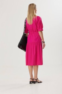 Платье А-силуэта ,длиной миди .Рукав со сборкой ,обработан манжетой ,длиной до линии локтя. По центу переда приточная планка, застегивающаяся на петли и пуговицы. По линии талии -кулиса .В боковых швах -карманы, по низу платья разрезы.