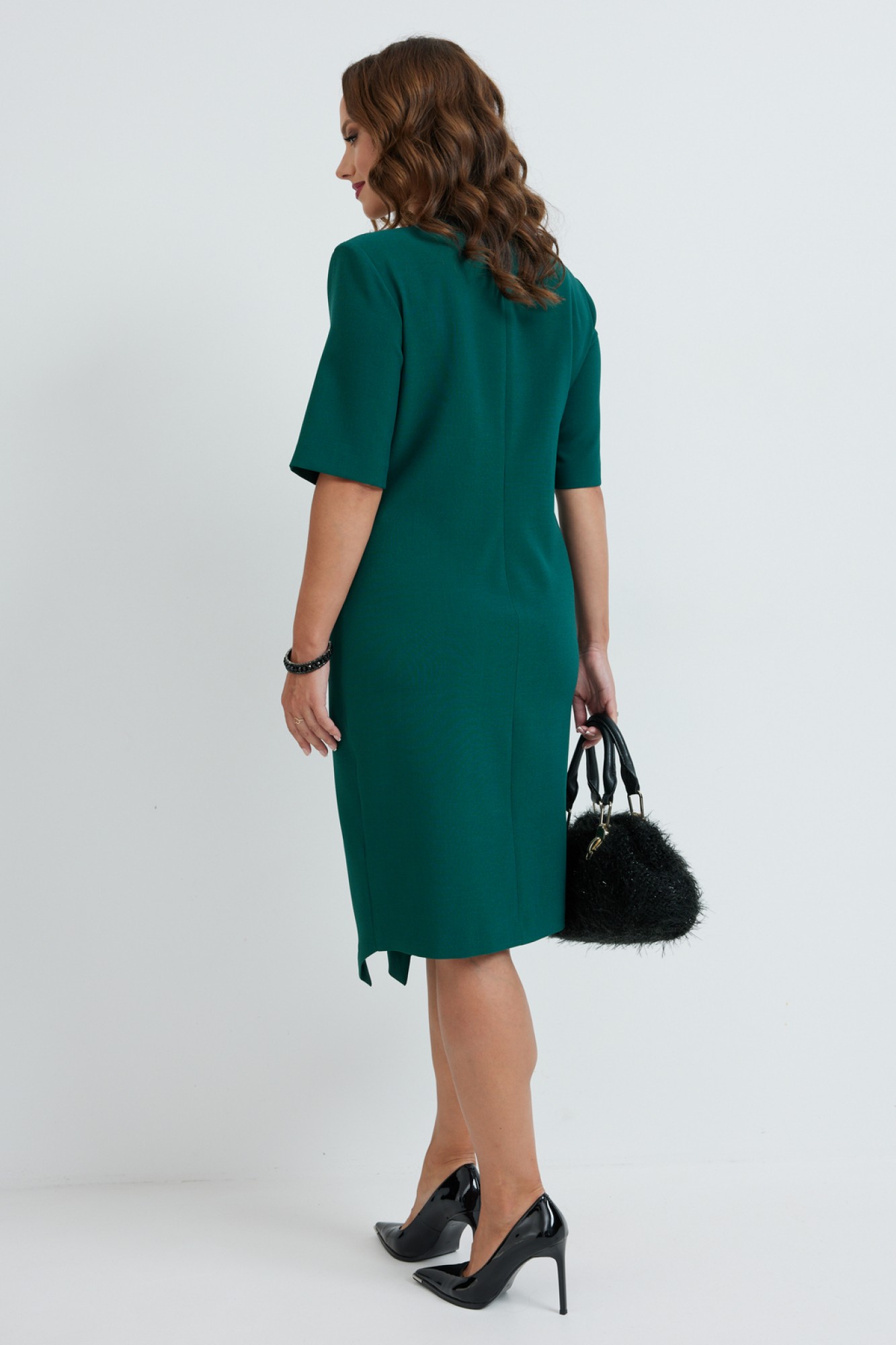 Эффектное платье прямого силуэта, выполненное из поливискозы двух цветов. Перед платья с круглой горловиной и нагрудными вытачками. Перед платья в области бедра с косым подрезом. Нижняя часть переда состоит из верхней и нижней юбки. Верхняя юбка с косым низом и разрезом. Нижняя юбка из ткани контрастного цвета, имитирующая вторую юбку. Спинка с потайной молнией в среднем шве. Рукав втачной, длиной до линии локтя. В комплект к платью входит декоративная подвеска.
