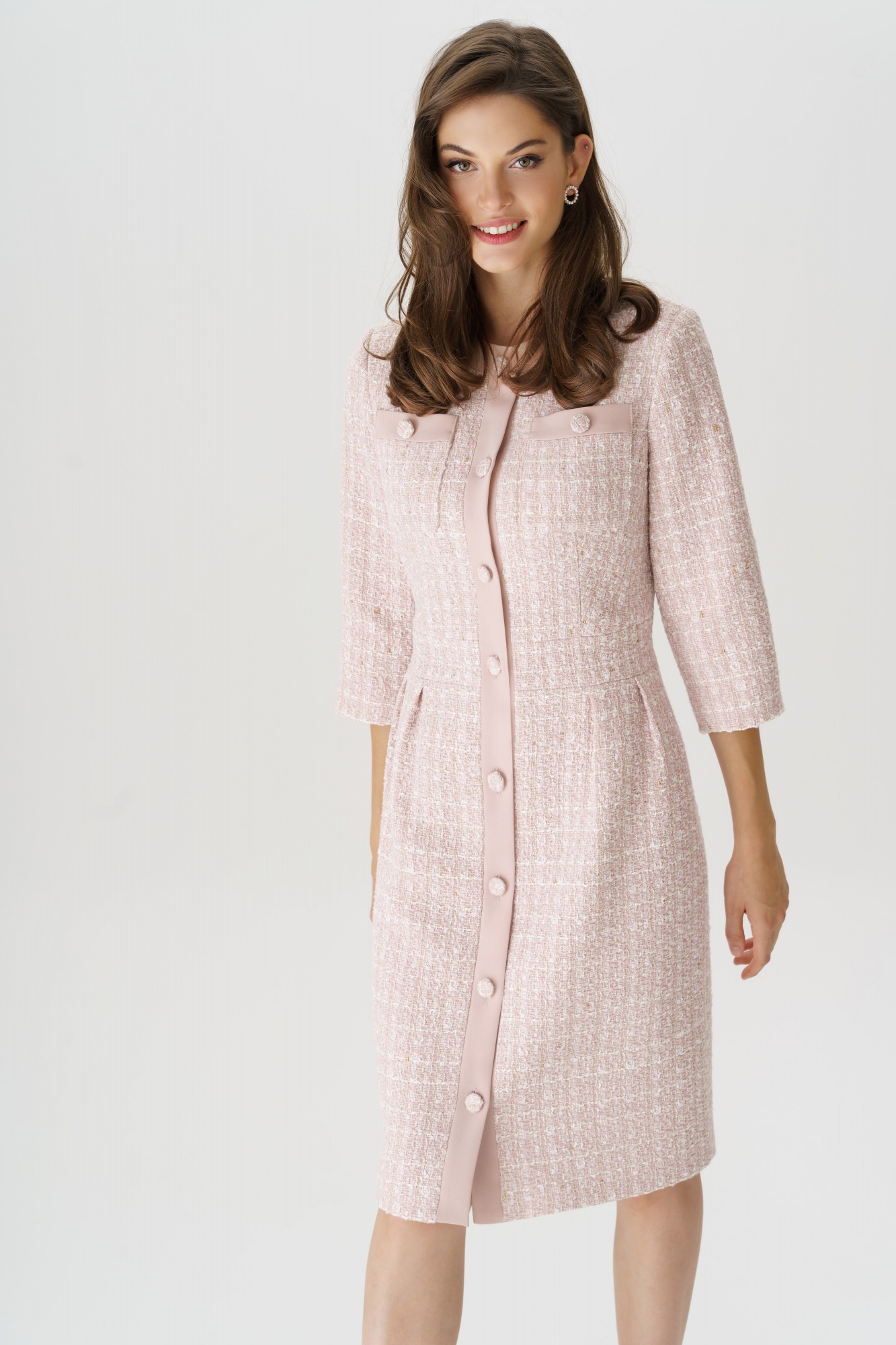 Платье женское полуприлегающего силуэта из костюмной твидовой ткани, отрезное по линии талии с втачным поясом, и отрезными планками из отделочного материала по борту, горловине и карману. Платье длиной до колена, на полной подкладке.