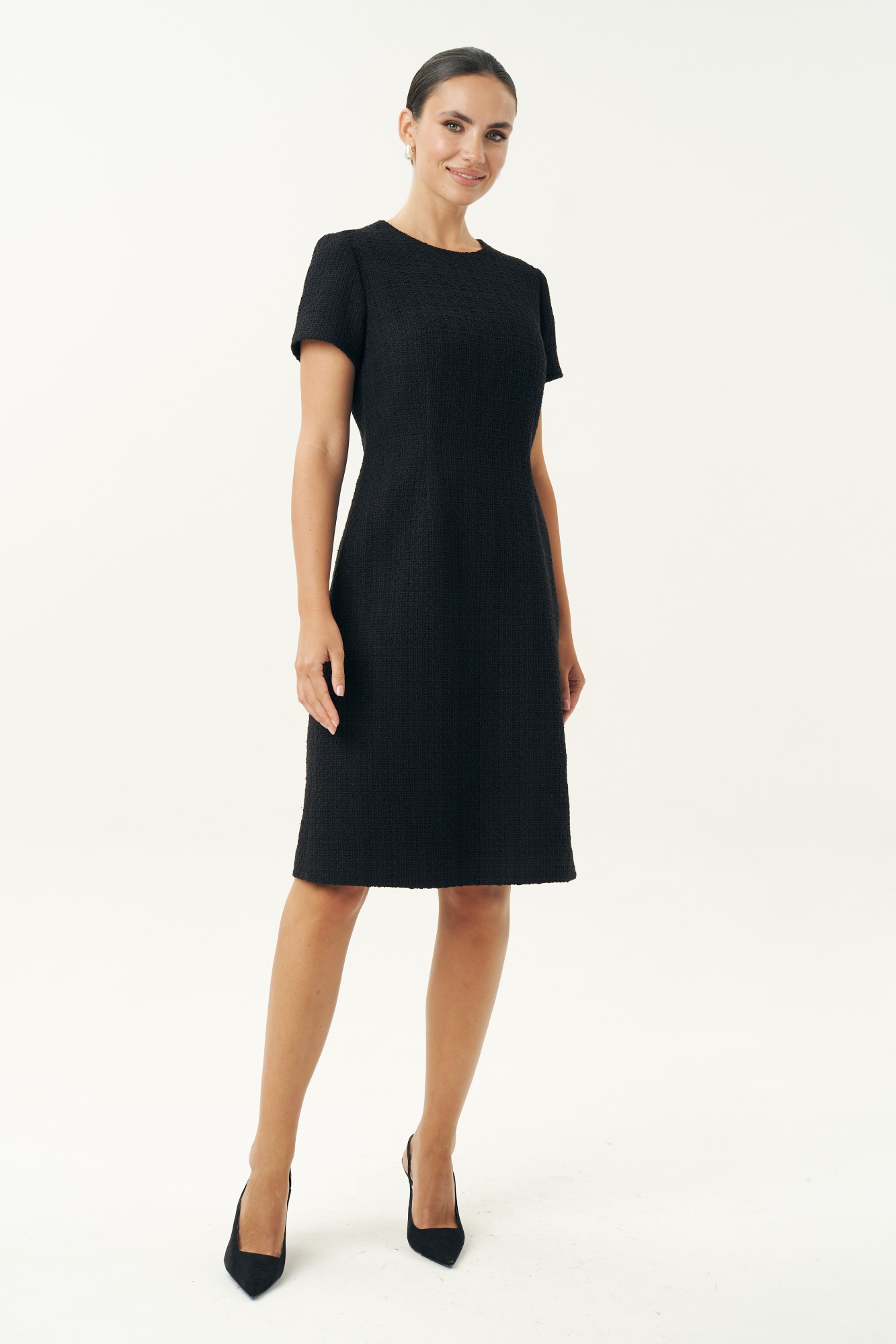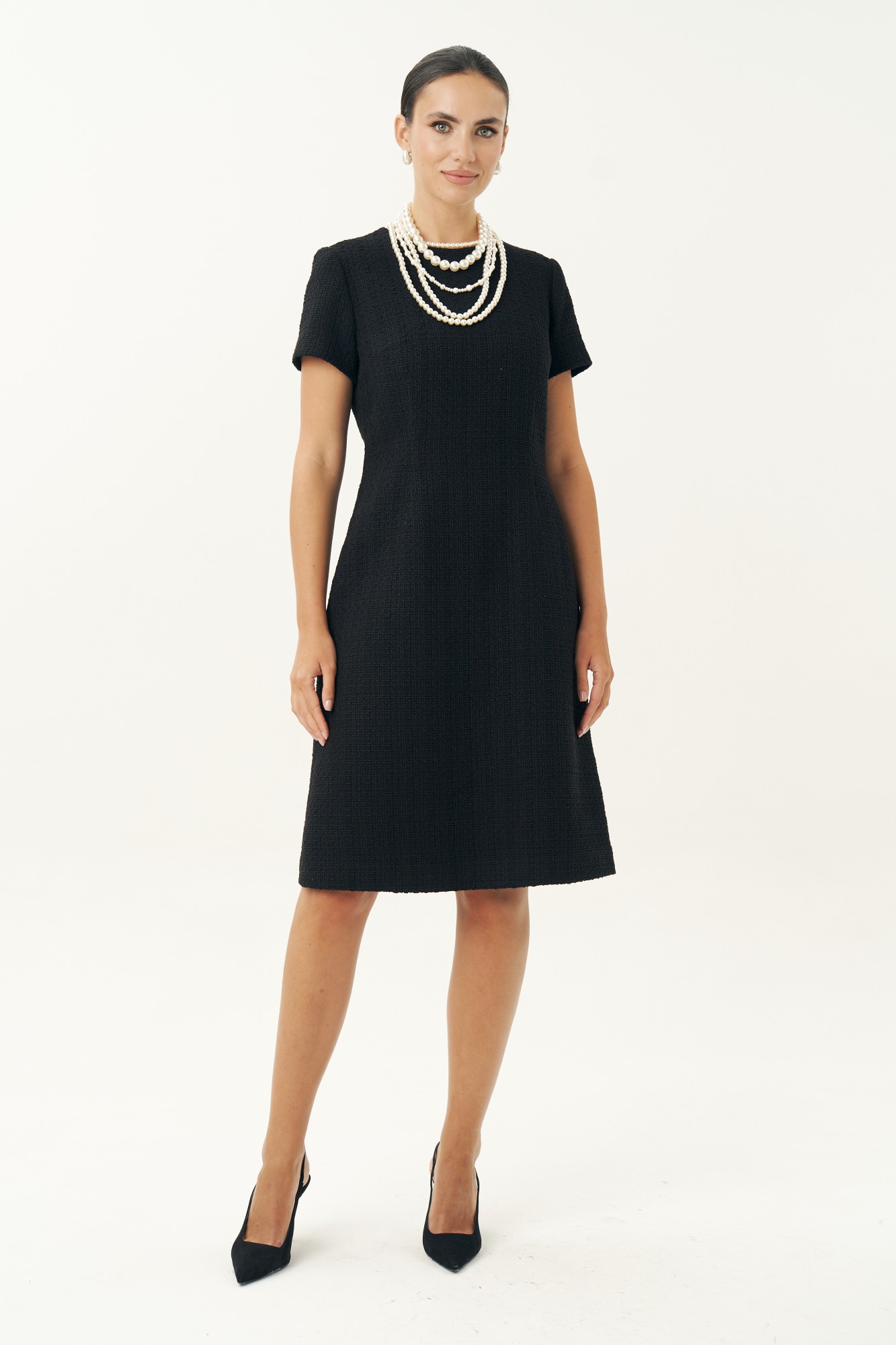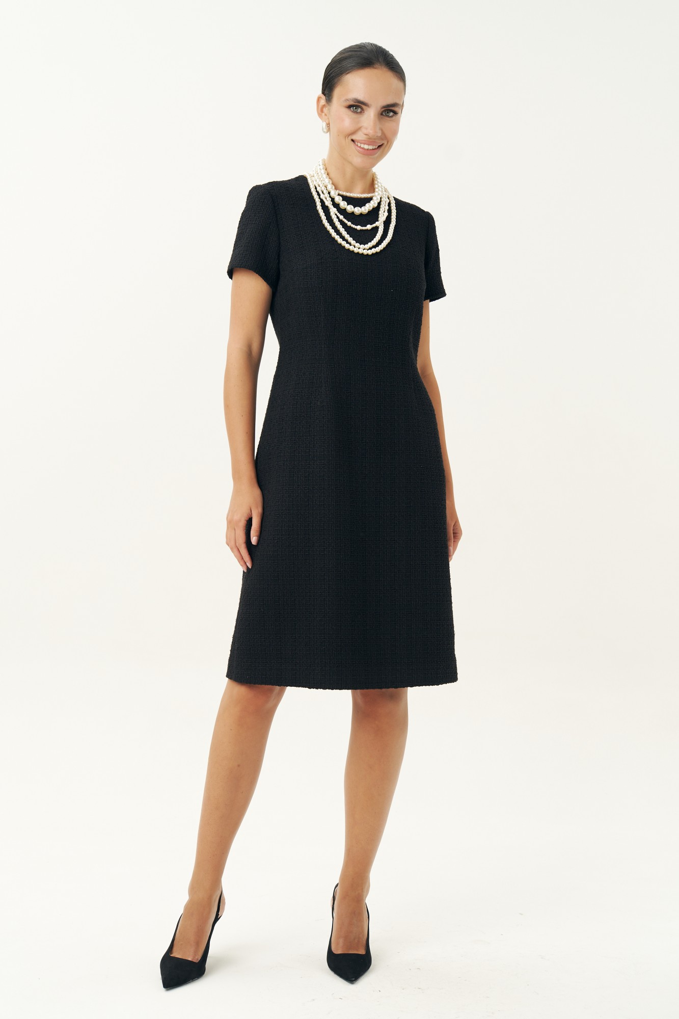Неизменно, черное маленькое платье остается образцом элегантности. Платье женское, выполнено из костюмной твидовой ткани, полуприлегающего силуэта, расширенное к низу, на трикотажной подкладке притачной по низу переда и спинке, по низам рукавов. Платье повседневное. Перед с таллиевыми вытачками, с нагрудными вытачками, идущими от боковых швов. Спинка с таллиевыми вытачками, со средним швом, в верхней части которого обработана застежка на потайную тесьму-молнию. Рукава втачные, одношовные, короткие. Горловина переда и спинки обтачная, округлая.
