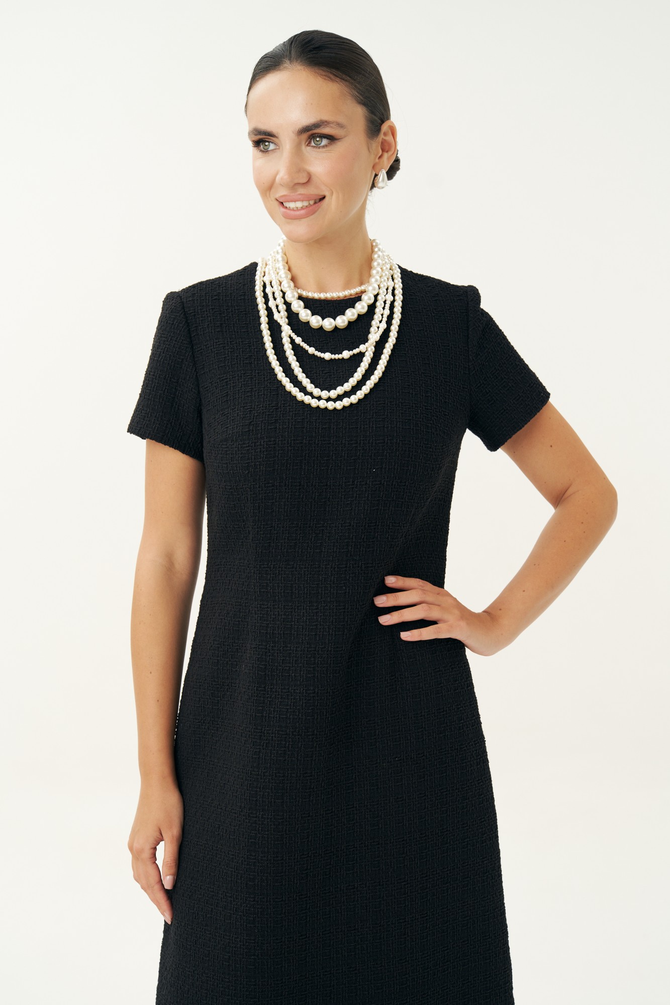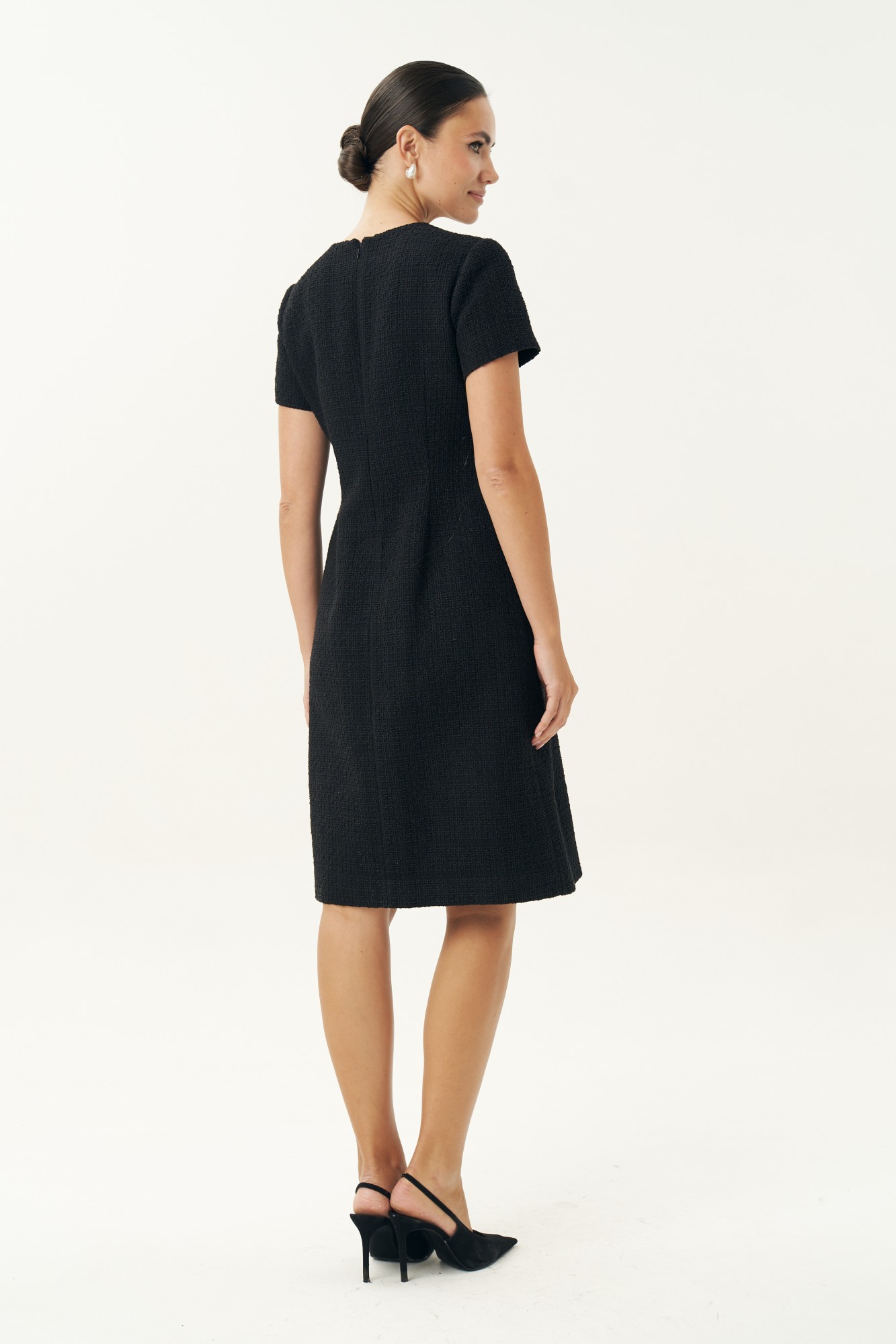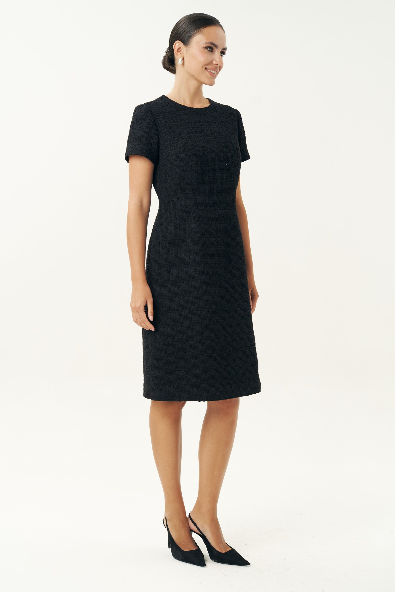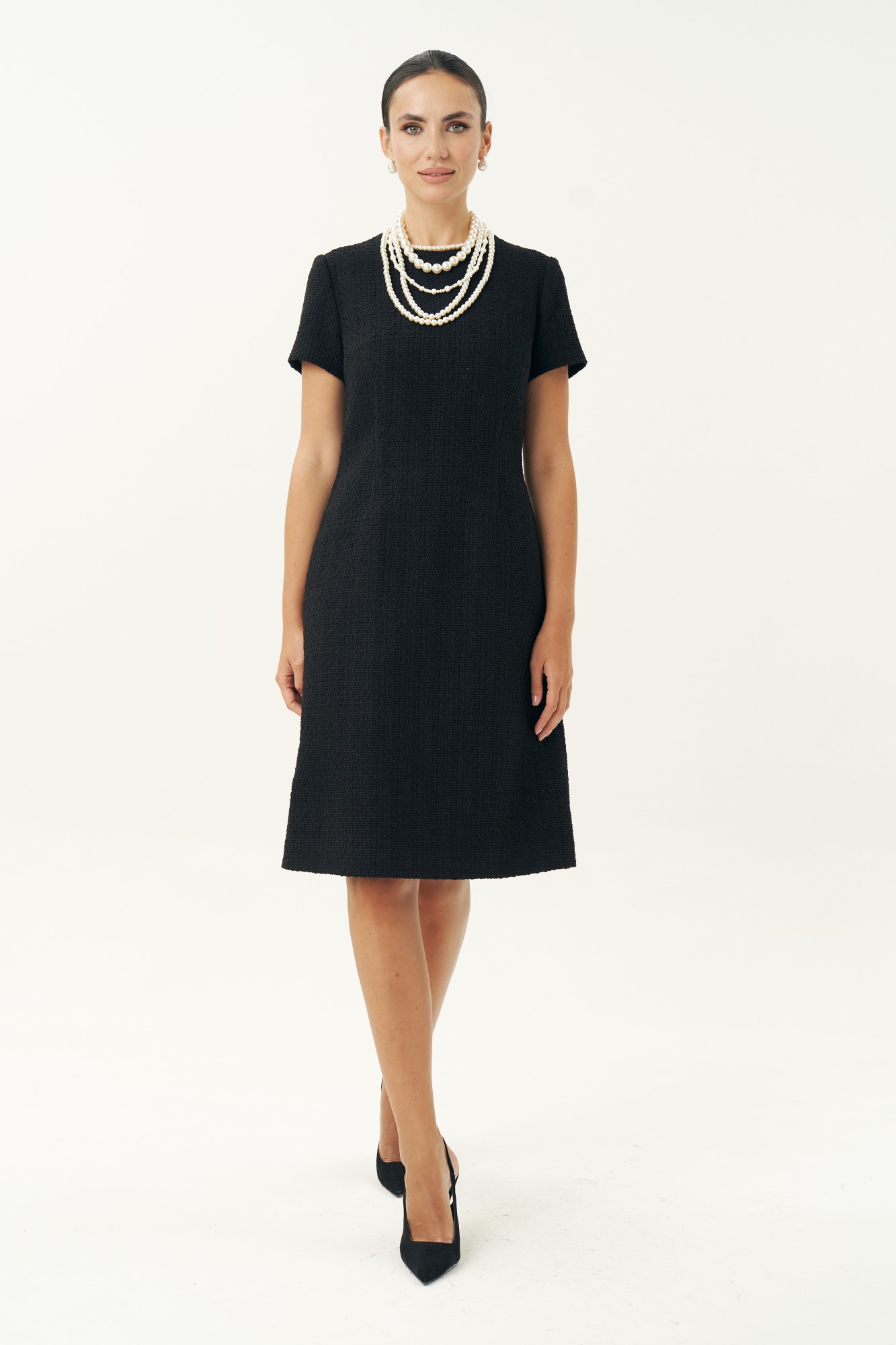 Неизменно, черное маленькое платье остается образцом элегантности. Платье женское, выполнено из костюмной твидовой ткани, полуприлегающего силуэта, расширенное к низу, на трикотажной подкладке притачной по низу переда и спинке, по низам рукавов. Платье повседневное. Перед с таллиевыми вытачками, с нагрудными вытачками, идущими от боковых швов. Спинка с таллиевыми вытачками, со средним швом, в верхней части которого обработана застежка на потайную тесьму-молнию. Рукава втачные, одношовные, короткие. Горловина переда и спинки обтачная, округлая.