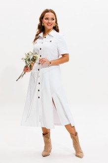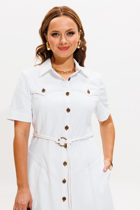 Платье женское приталенного силуэта расклешённое книзу. Центральная бортовая застёжка с планкой на петли-пуговицы. Полочка и спинка с кокетками, рельефами, фигурным подрезом ниже линии талии и отделочными строчками. По низу рельефов полочки разрезы. Карманы в боковых швах. Воротник на стойке блузочного типа. Рукав втачной. Внутренние кокетки, стойка, нижний воротник и обтачка рукава выполнены из отделочной х\б ткани с мелким принтом. Навесной пояс из декоративного шнура.