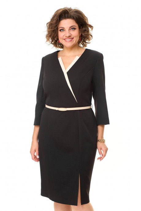 Платье женское полуприлегающего силуэта с естественной линией плеча. Рукав 3/4 втачной двухшовный с разрезом в локтевом шве. Горловина V-образной формы с контрастными планками. По переду выполнены полурельефы выходящие из пройм. Спинка с вытачками. В среднем шве спинки застежка на потайную тесьму-молнию и шлица. Имеется отделочный навесной пояс.
