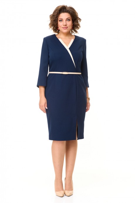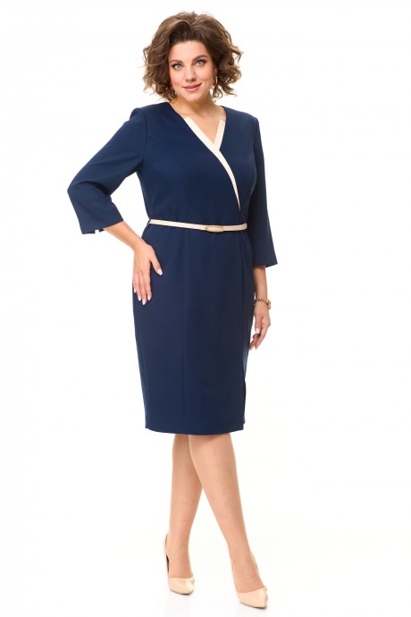 Платье женское полуприлегающего силуэта с естественной линией плеча. Рукав 3/4 втачной двухшовный с разрезом в локтевом шве. Горловина V-образной формы с контрастными планками.