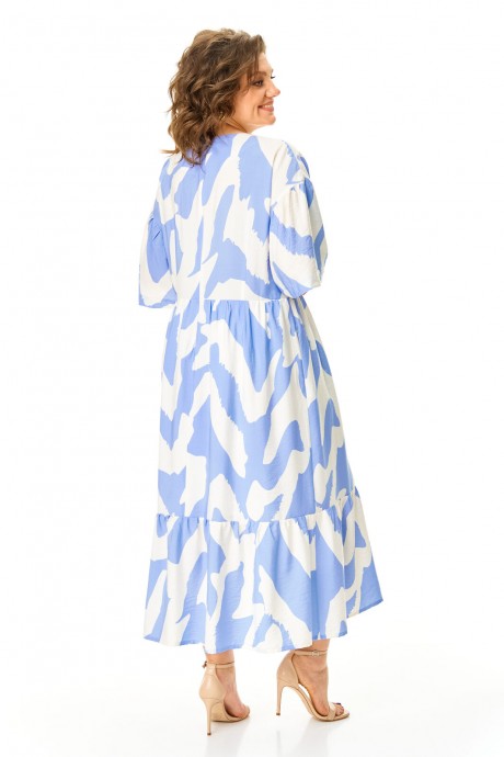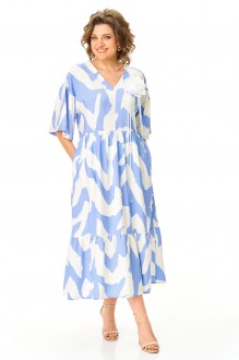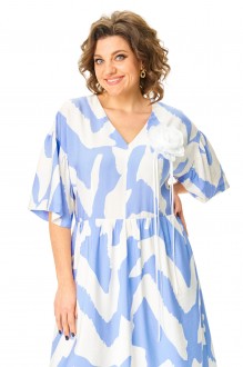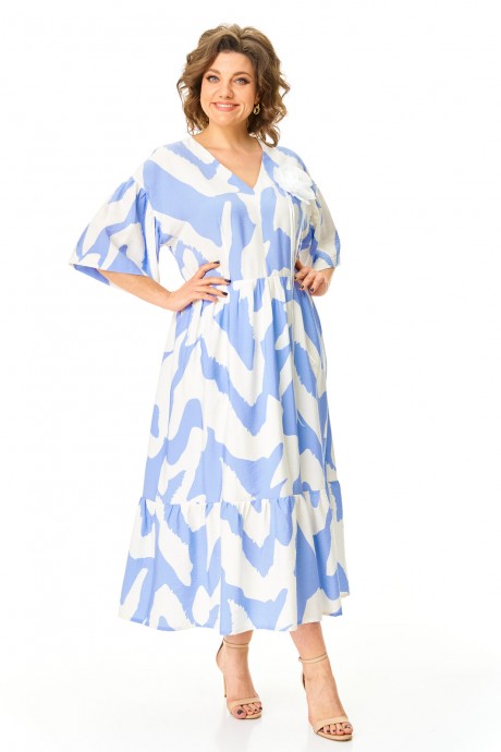 Платье женское А-образного силуэта со спущенной линией плеча. По окату рукава обработана сборка. Горловина V-образной формы. В среднем шве спинки застежка на тесьму-молнию. Перед и спинка выполнена последовательными оборками создающими легкое расклешение низу. В боковых швах обработаны карманы. В комплект входит съемная брошь в виде цветка.