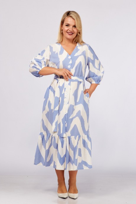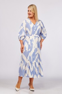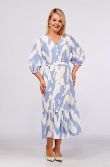 Платье женское А-образного силуэта с естественной линией плеча.Рукав втачной до линии локтя.Горловина округлой формы.Перед с нагрудной вытачкой и ассиметричным подрезом.По низу переда и спинки обработана оборка.В боковых швах обработаны карманы.В комплект входит съемная подвеска.