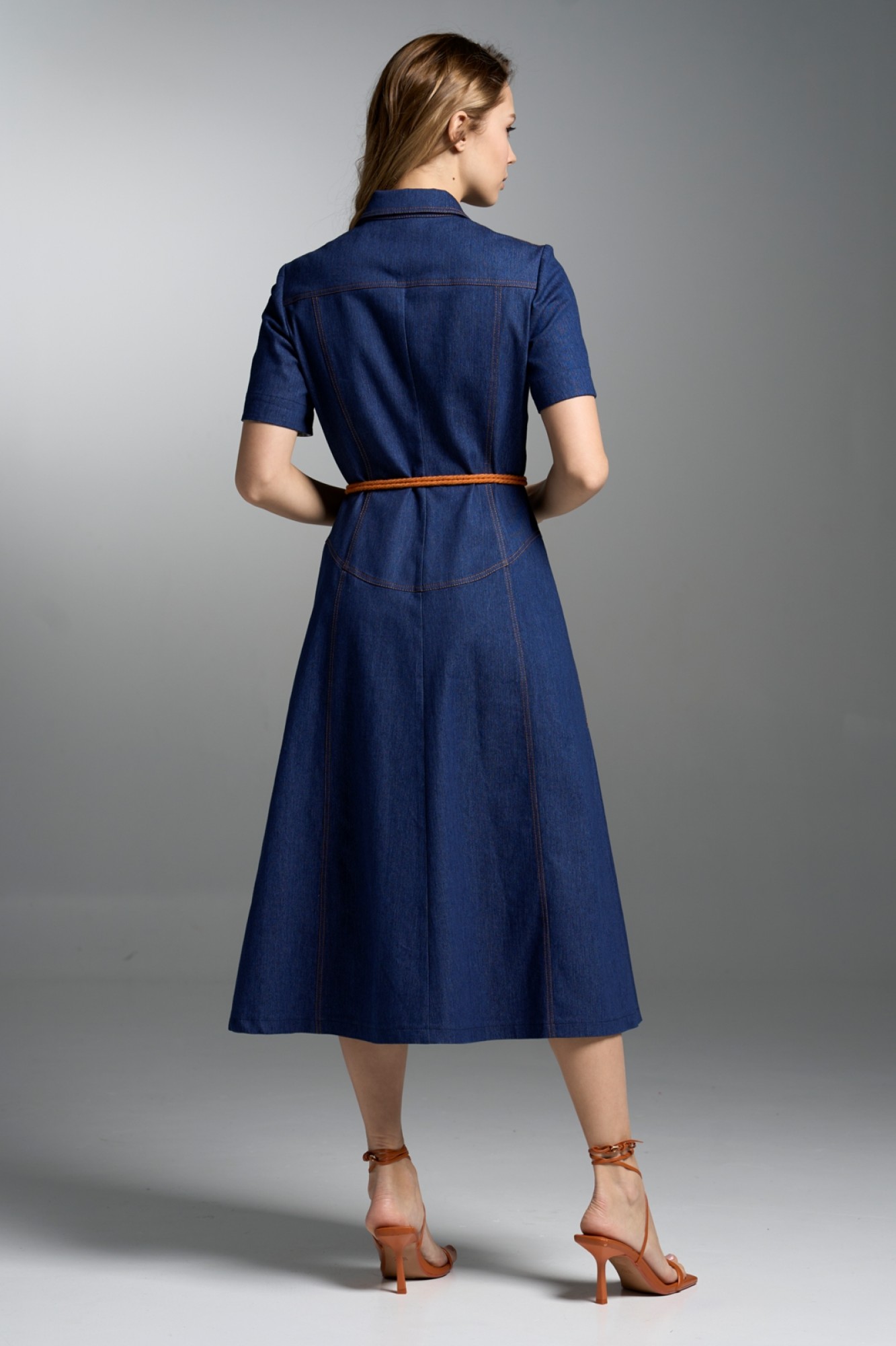 Платье женское приталенного силуэта расклешённое книзу. Центральная бортовая застёжка с планкой на петли-пуговицы. Полочка и спинка с кокетками, рельефами, фигурным Рукав втачной. Внутренние кокетки, стойка, нижний воротник и обтачка рукава выполнены из отделочной хб ткани с мелким принтом. Навесной пояс из декоративного шнура и застежкой на крючок.