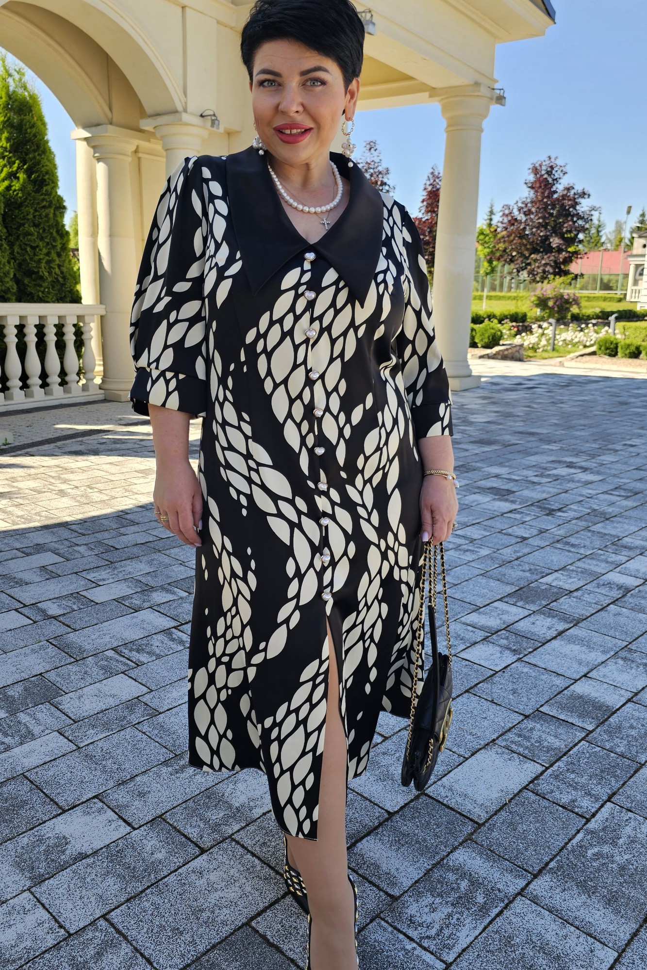 Элегантное и изящное платье в стильном исполнении - не оставит Вас незамеченной и создаст неповторимый образ. Данная модель стройнит, вытягивает силуэт, подчеркивает достоинства фигуры. А благодаря чёрному цвету - оно всегда будет актуальным. Платье полуприлегающего силуэта расширяется к низу. Горловина с V-образной формы, оформлена отложным воротником из отделочной ткани. По переду платья нагрудные и талиевые вытачки, средний шов с отделкой в виде декоративных пуговиц, заканчивается разрезом. В боковом шве платья застёжка на потайную тесьму-молнию. Спинка в платье с талиевыми вытачками. Рукав в платье втачной, длины ¾ с заложенными складками по окату рукава, низ рукава с декоративной встречной складкой и притачной манжетой.