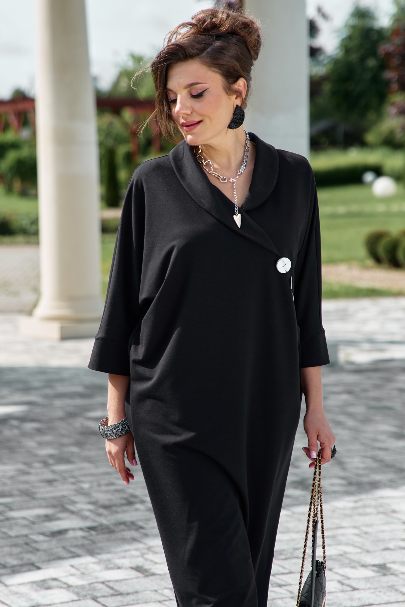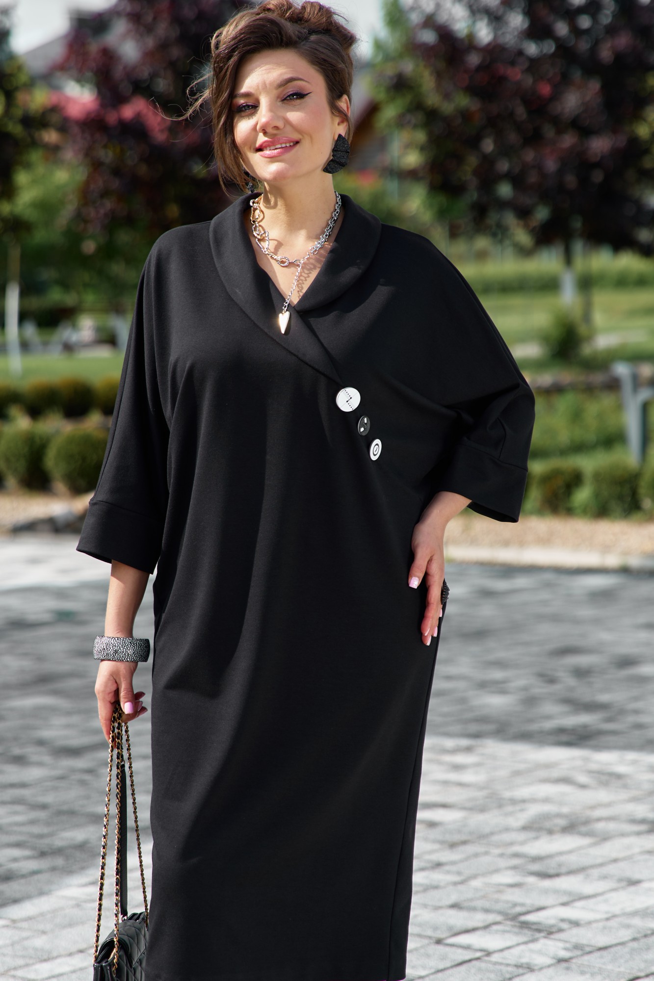 Интересный крой платья и пластические свойства трикотажного полотна помогут скрыть недостатки фигуры и создать идеальный образ. Платье свободного силуэта, заужается к низу. Горловина в платье открытая, с ассиметричным отложным воротником переходящим в подрез по переду платья. Спинка со средним швом. Рукав в платье по форме «летучая мышь» с притачной манжетой по низу. В качестве главного акцента платья, который приковывает взгляды, являются пришивные декоративные пуговицы контрастного цвета и разных размеров.