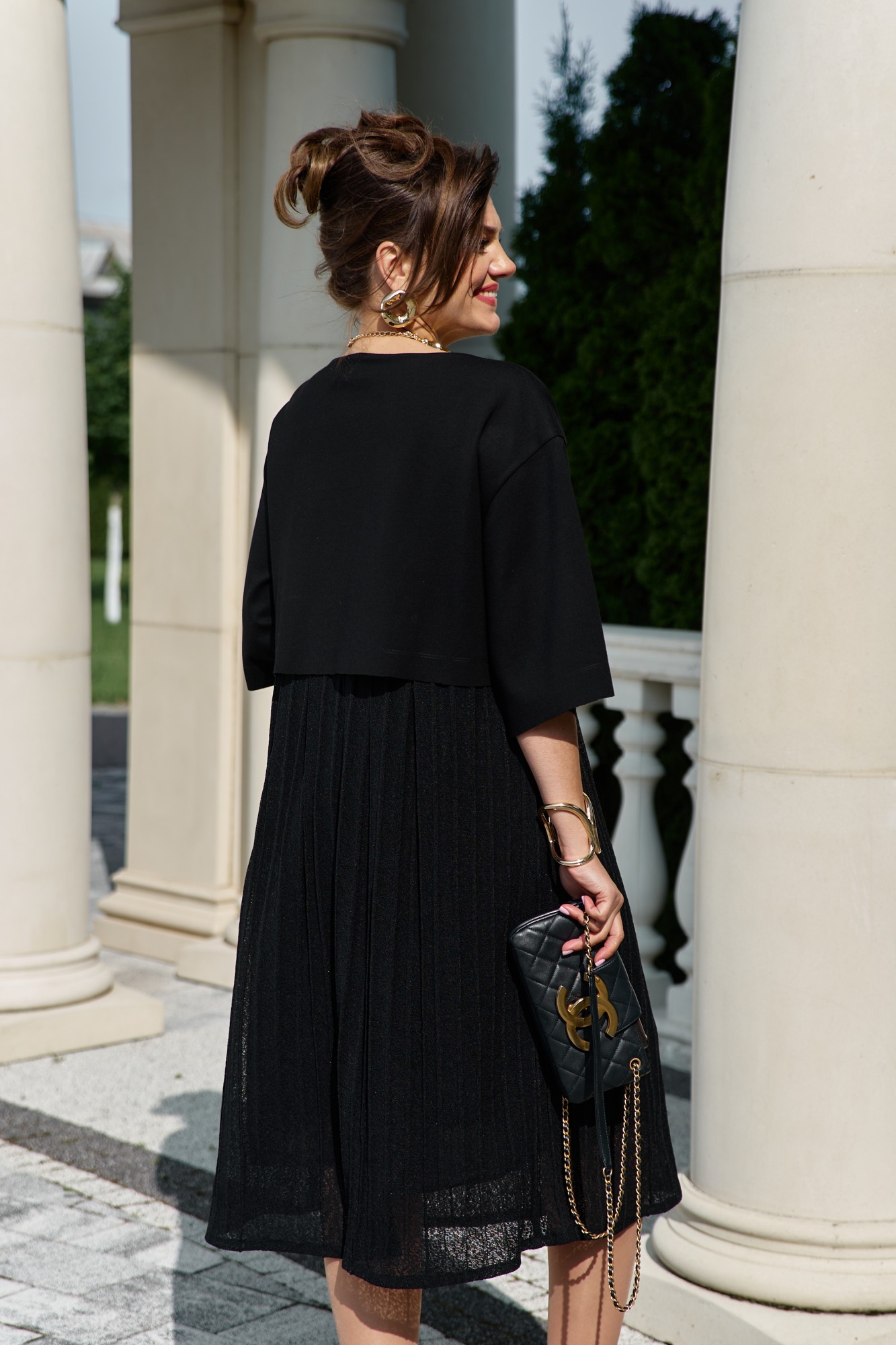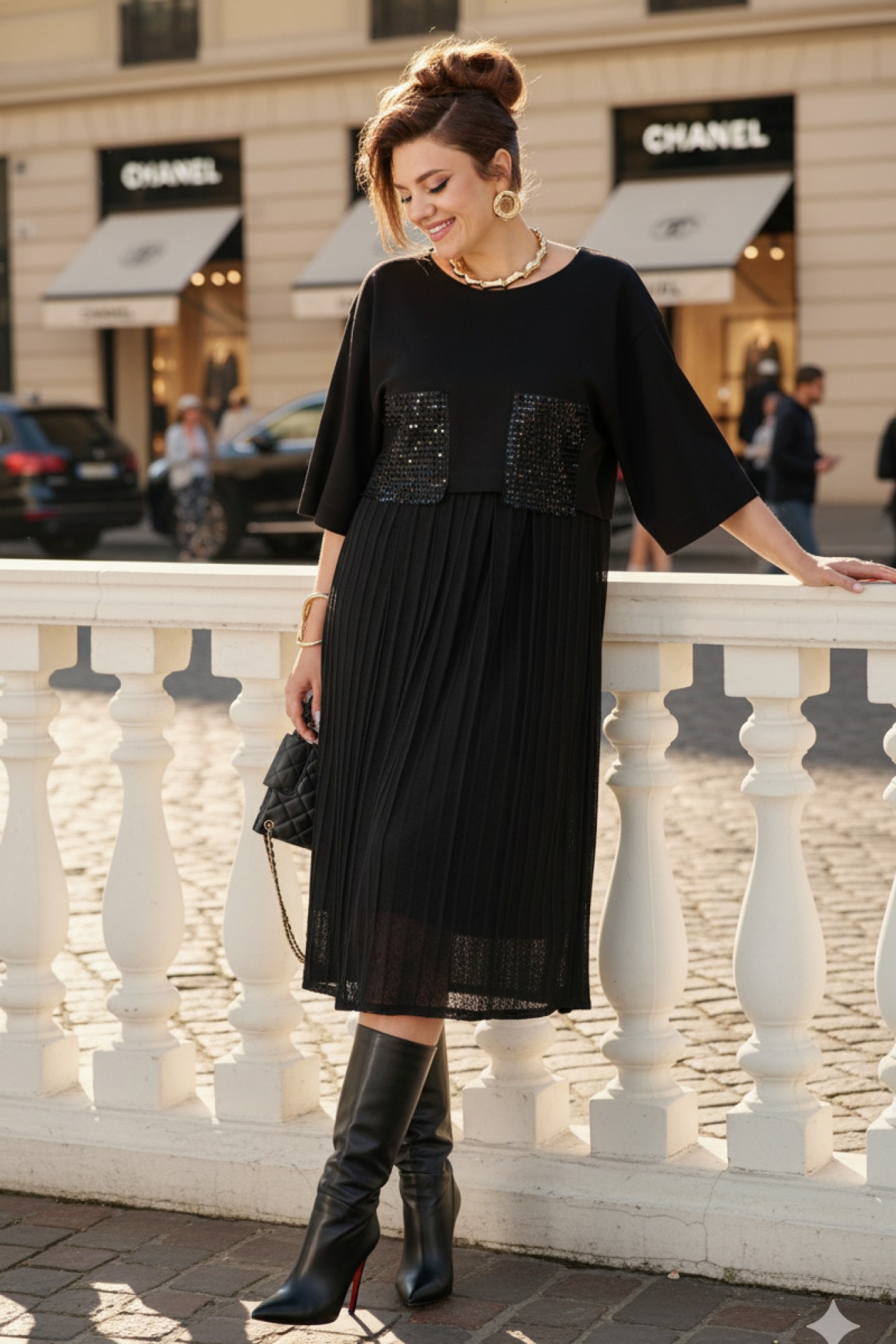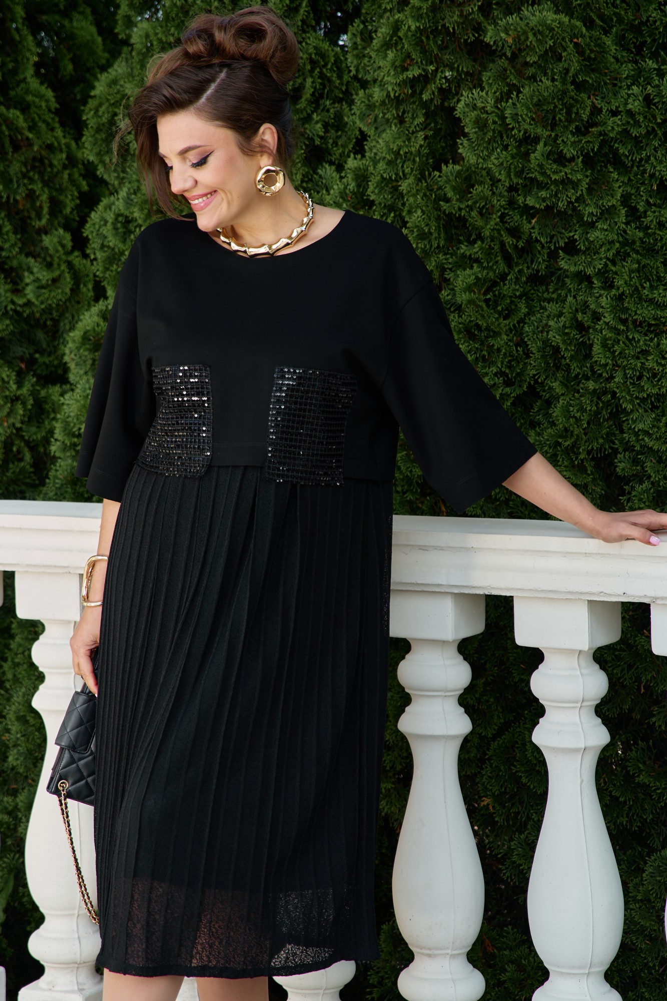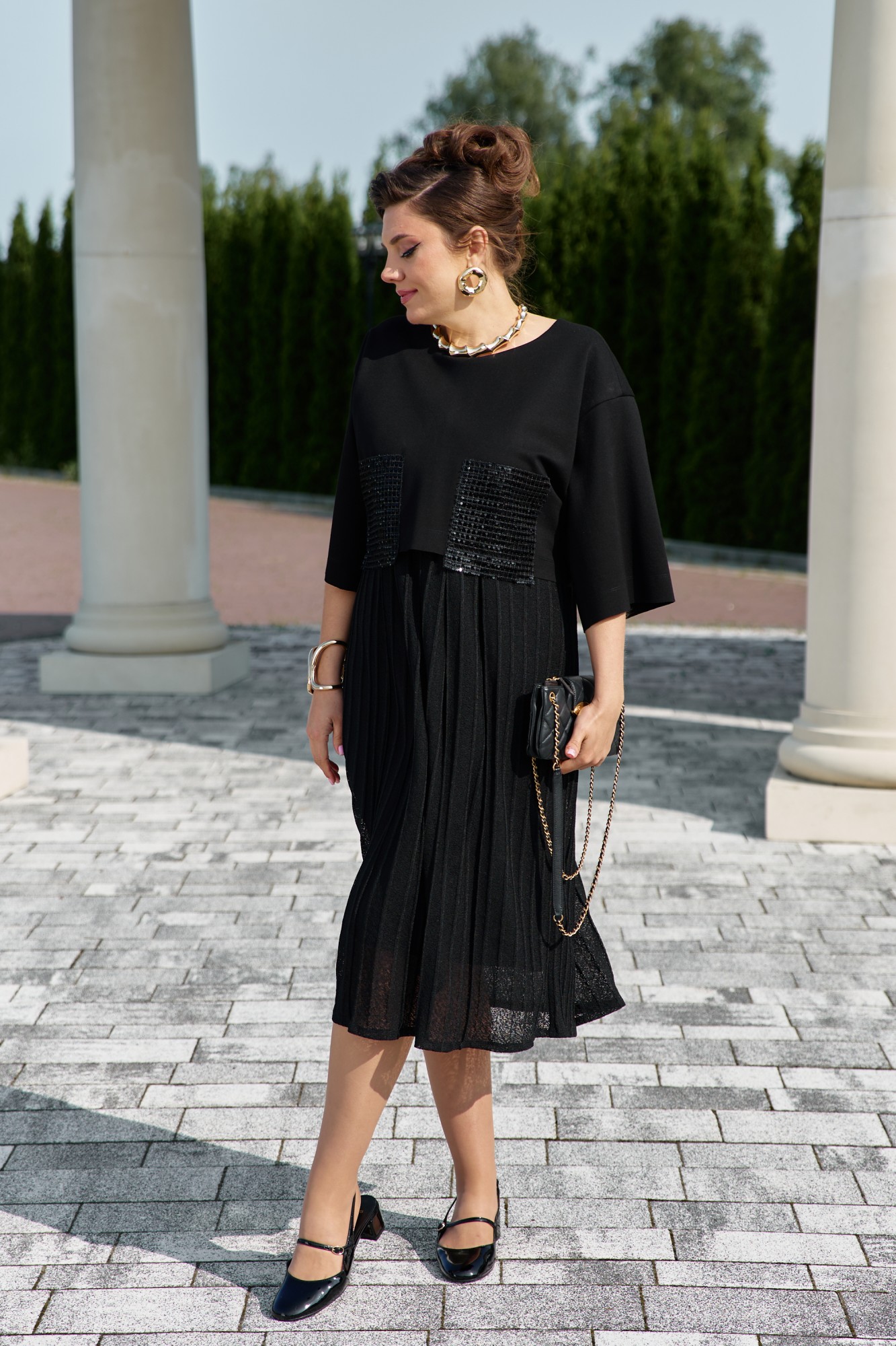 Если вы ищете идеальное сочетание стиля и комфорта, вот идеальный выбор. Мы специально подобрали качественную и тактильно приятную ткань, которая хорошо держит свою форму, создавая элегантный и лаконичный образ. Плотная структура ткани создаёт строгий и благородный образ. Платье прямого силуэта, с расклешенным низом , с округлой формой горловины и нагрудными карманами по переду из отделочной эффектной ткани с открытым срезом, низ верхней части также с открытым срезом. Нижняя часть платья выполнена из трикотажа с эффектом полоски, что зрительно стройнит фигуру. Плюс застроченный кант для складки придает дополнительный шарм. Спинка платья верхняя часть цельная без особенностей.