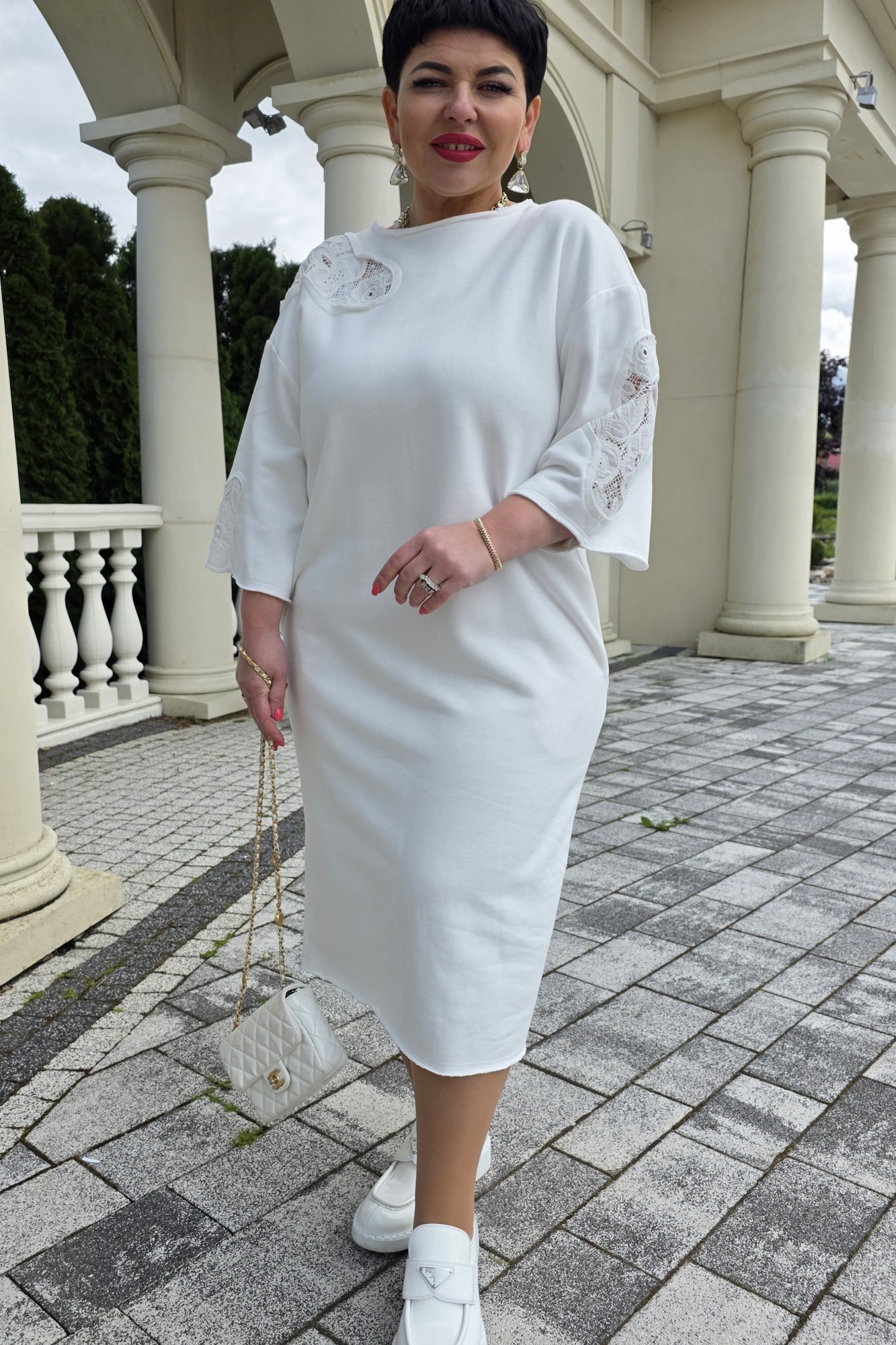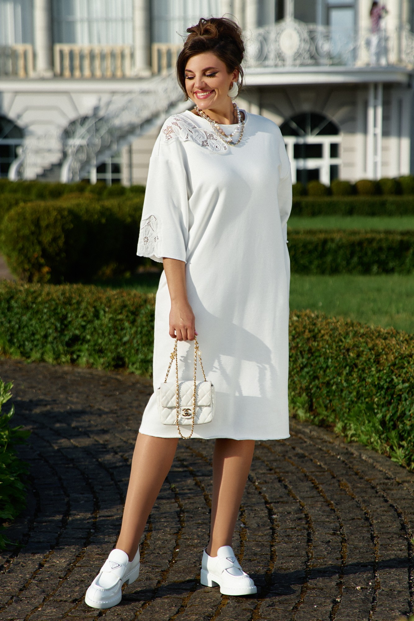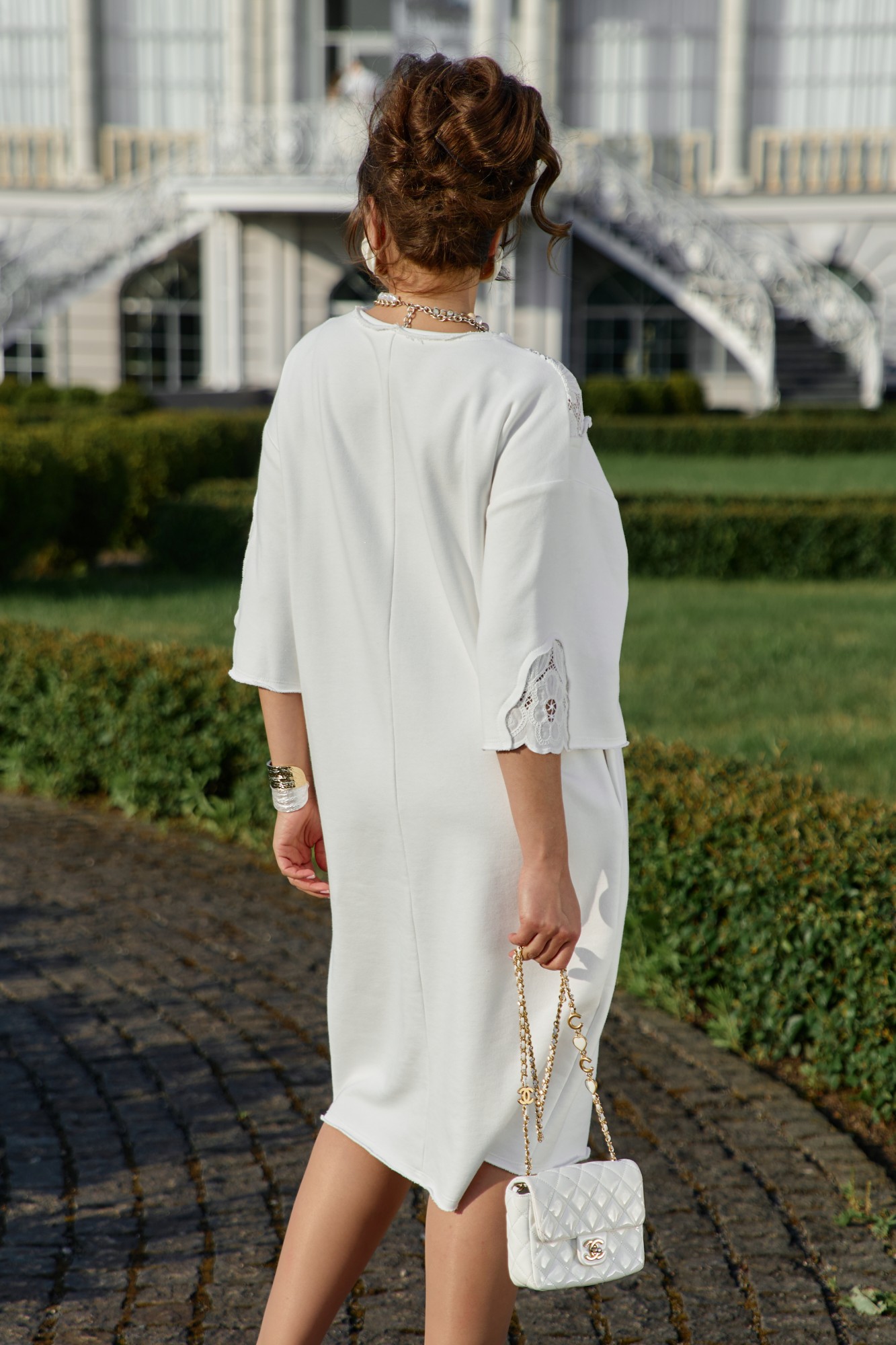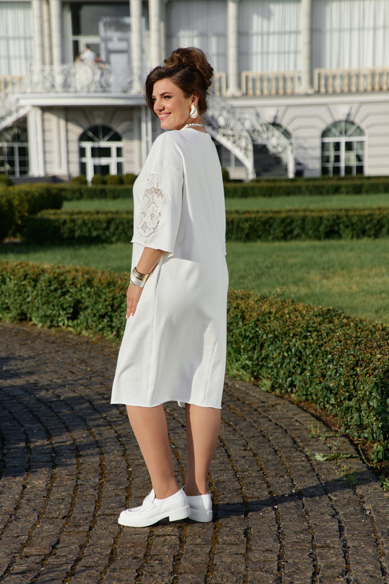 Если Вы ищете идеальное сочетание стиля и комфорта, вот идеальный выбор. Мы специально подобрали качественную и тактильно приятную ткань, которая хорошо держит свою форму, создавая ощущение легкости и свободы движения. Отделочные вставки из вышитого ришелье в тон добавляют образу романтичные нотки. Платье свободного силуэта с округлой формой горловины, линия плеча спущенная. По переду платья декоративная вставка из отделочного материала- вышивки ришелье. Спинка в платье с средним швом. Рукав втачной, длиной 7/8. В качестве дополнительного декоративного элемента в рукавах ассиметричные вставки из ришелье. Главной особенностью в изделии является эффект необработанных срезов, который добавляет образу дерзости.