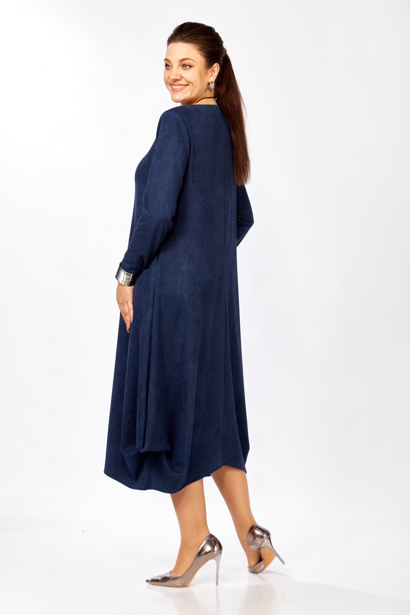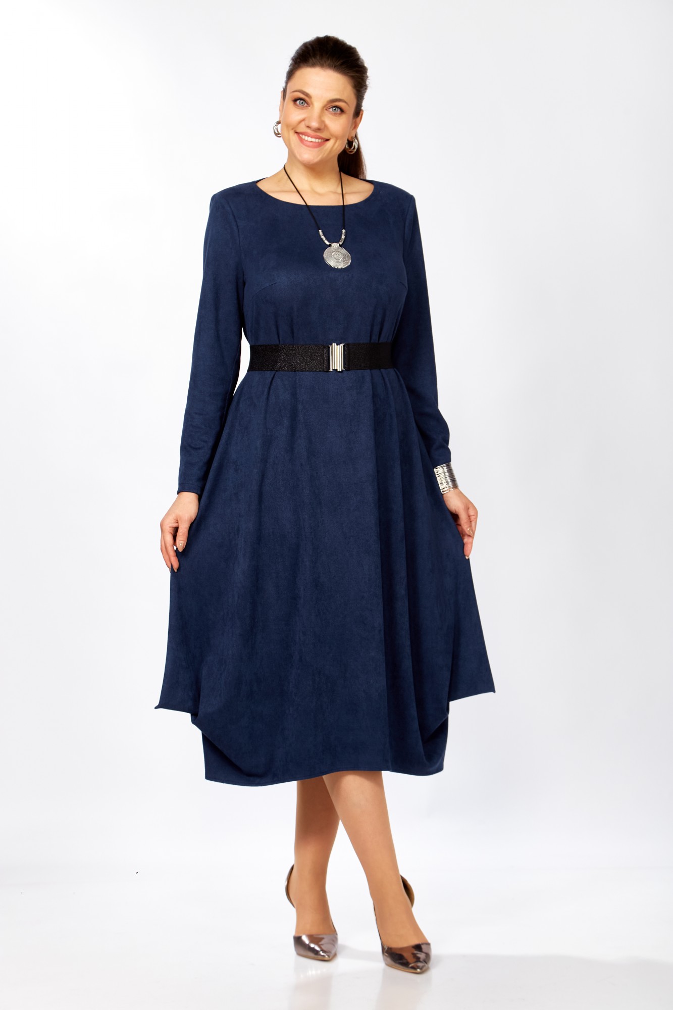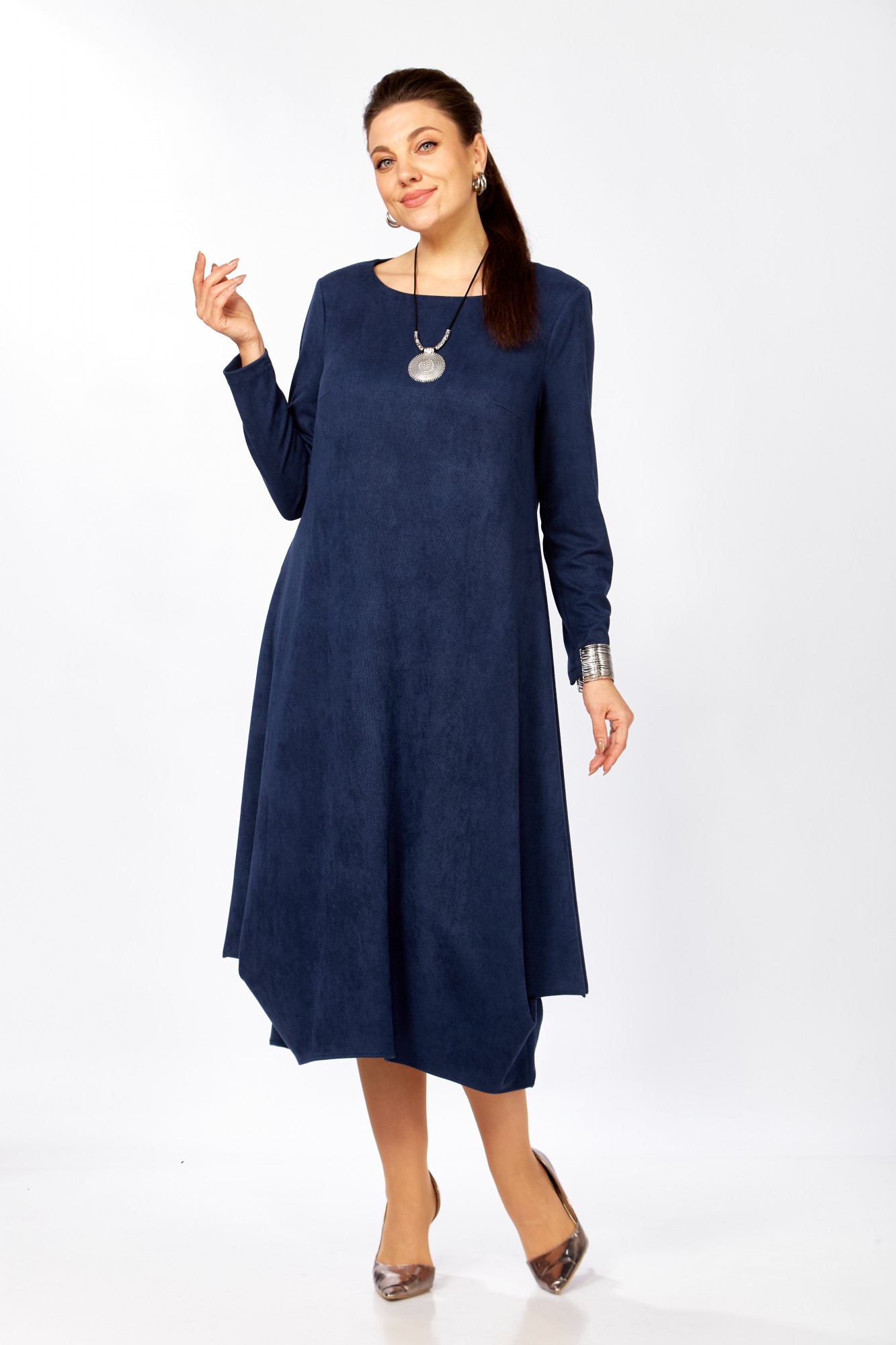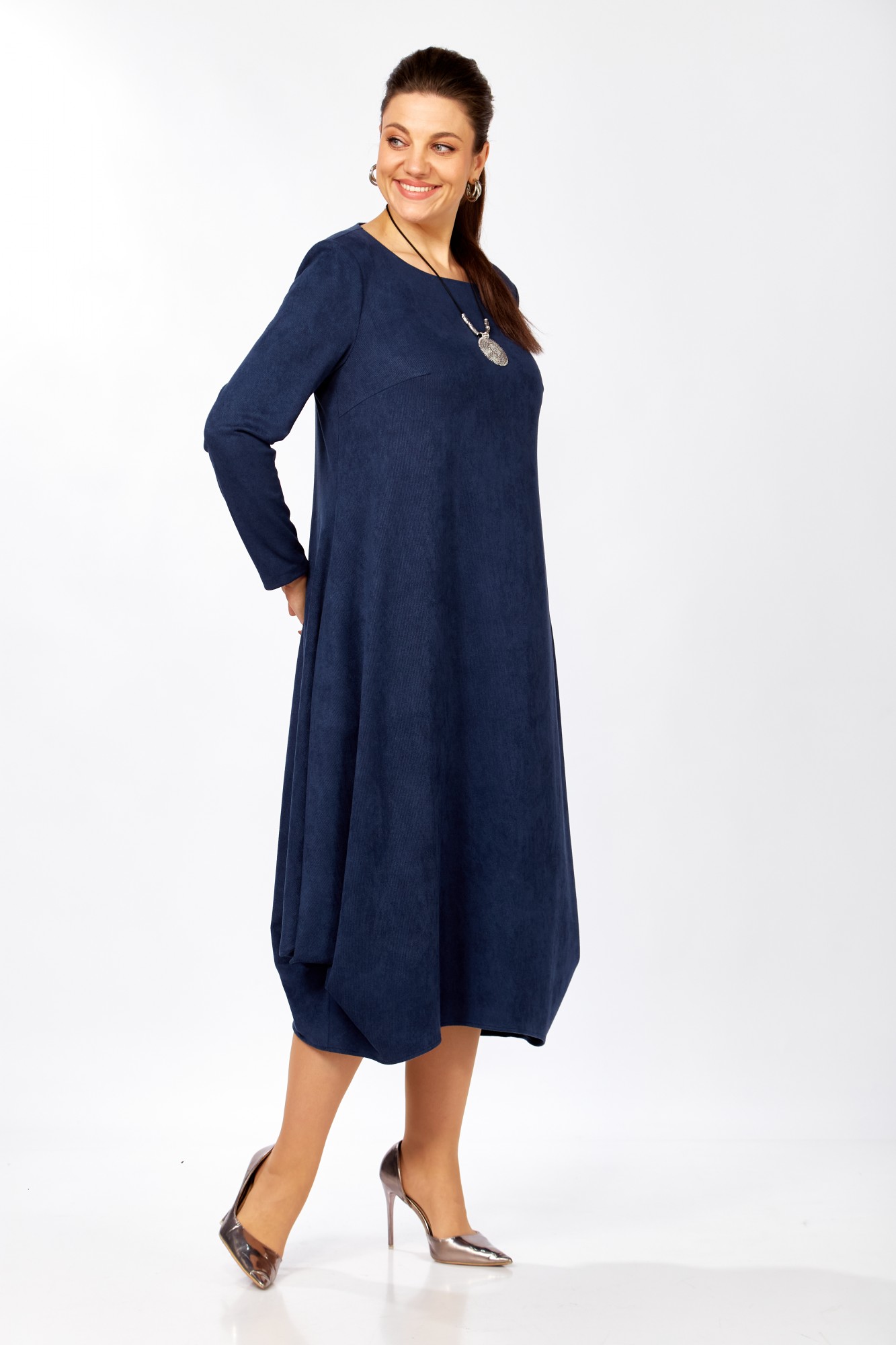 Базовое элегантное платье расширенного силуэта в стиле «бохо» с ассиметричным подолом. Модель выполнена из тонкой трикотажной ткани синего оттенка, свободно струящейся по фигуре, создавая утонченный силуэт. Длинные рукава и длина миди делают его идеальным для повседневной носки. Вырез горловины округлой формы у боковых швов со складками. Платье дополнено поясом, что позволяет регулировать ширину по линии талии.