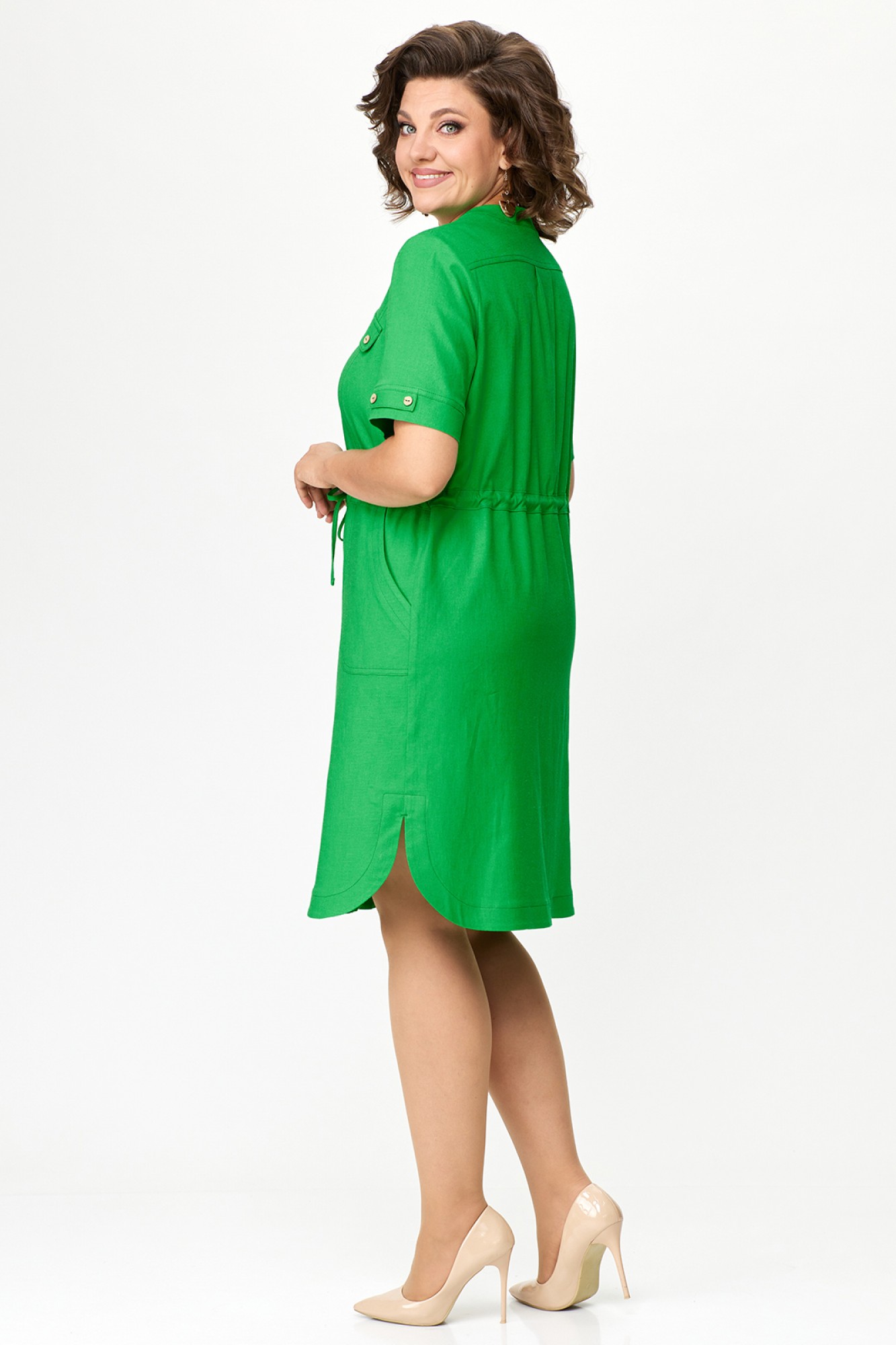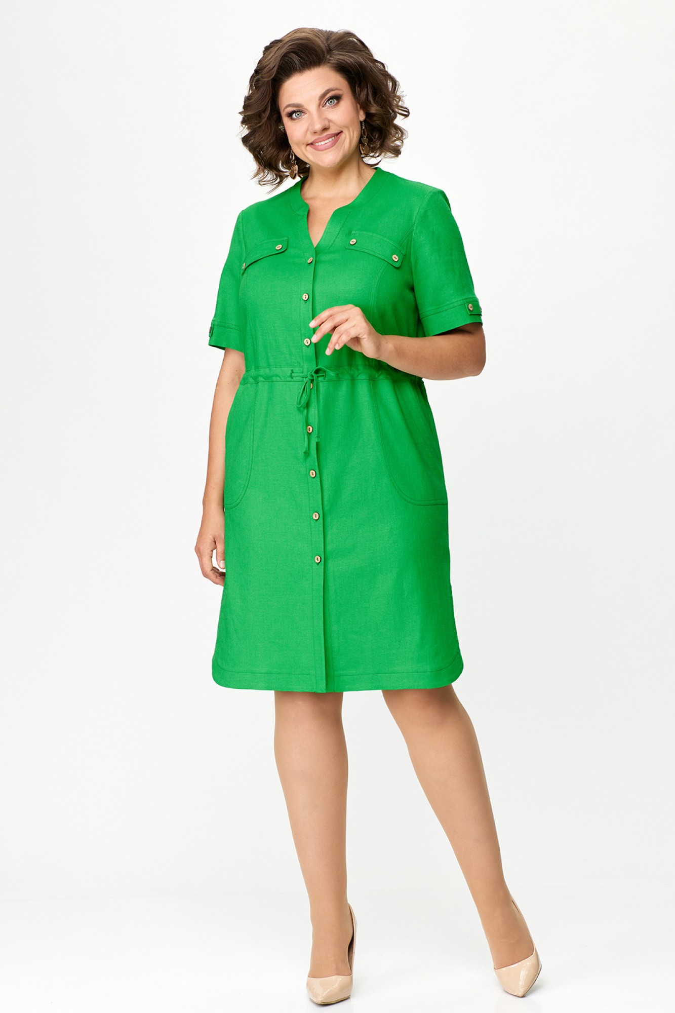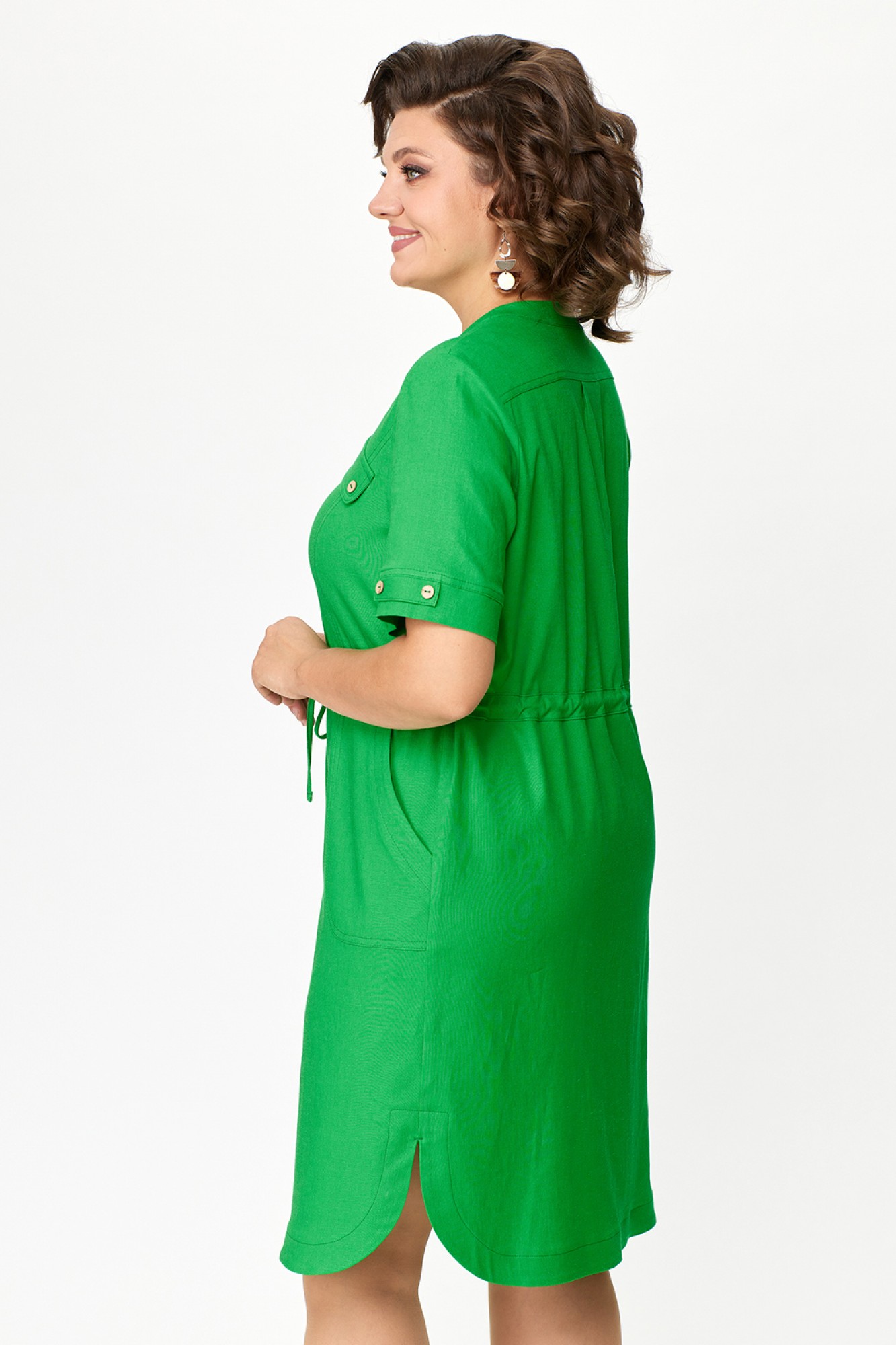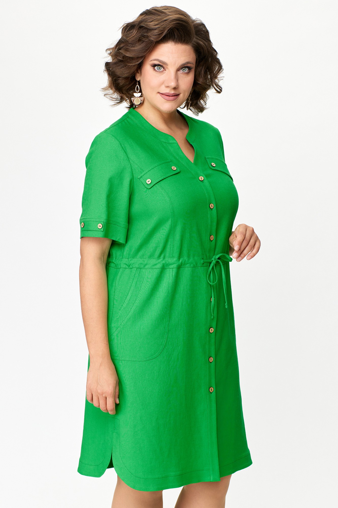 Женское летнее платье прямого силуэта из льняной ткани. Вырез горловины фигурный V-образный. Рукав короткий с манжетой и декоративными элементами. Застежка на пуговицах. По талии кулиска со шнуром. По бокам закругленные разрезы. Спереди снизу накладные карманы и декоративные карманы на груди. По спинке кокетка с бантовой складкой.