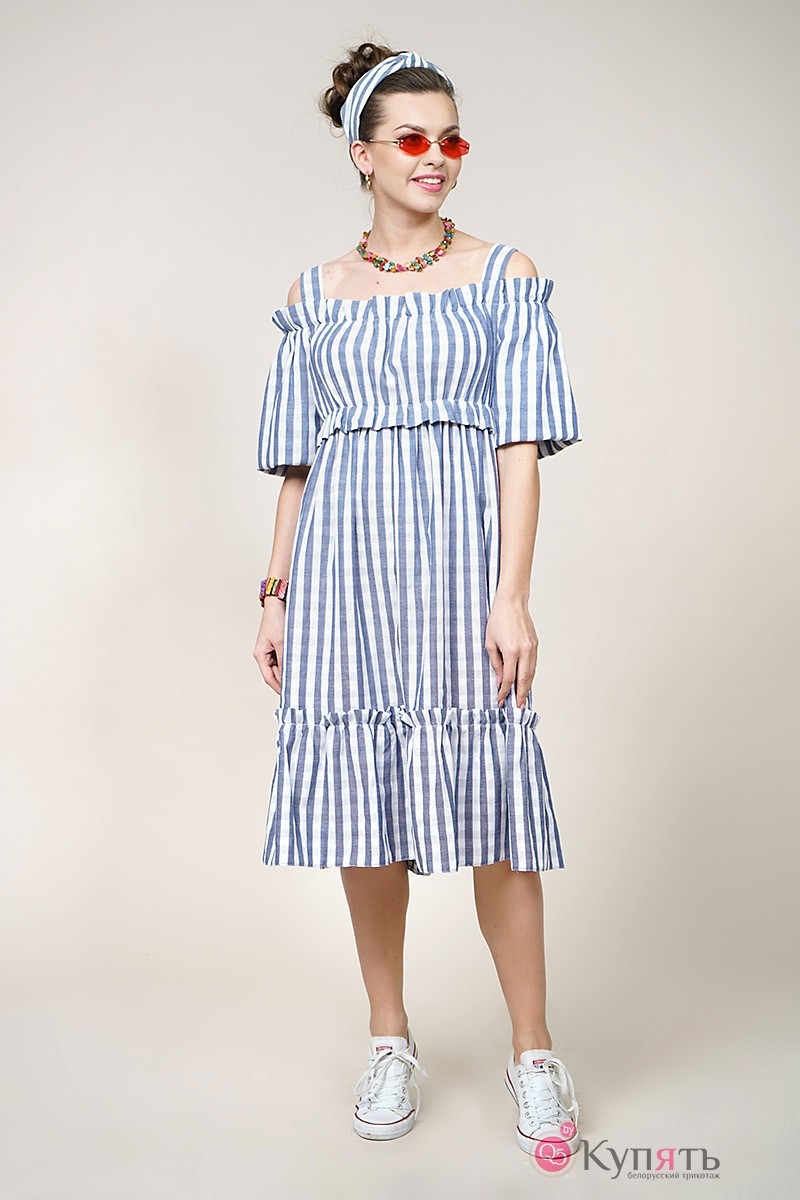 Платье свободного силуэта на бретелях и с открытыми плечами. Платье отрезное чуть выше линии талии и эластичной тесьмой, вложенной в шов запаса. По линии низа платье с притачной оборкой. Верхний край переда и спинки со сборкой и, на расстоянии 4 см вниз, эластичной тесьмой, вложенной в шов запаса. Рукава на подкладке, длиной 3\4, в верху с эластичной тесьмой для фиксации на предплечье. Ткань из двухстороннего хлопка.