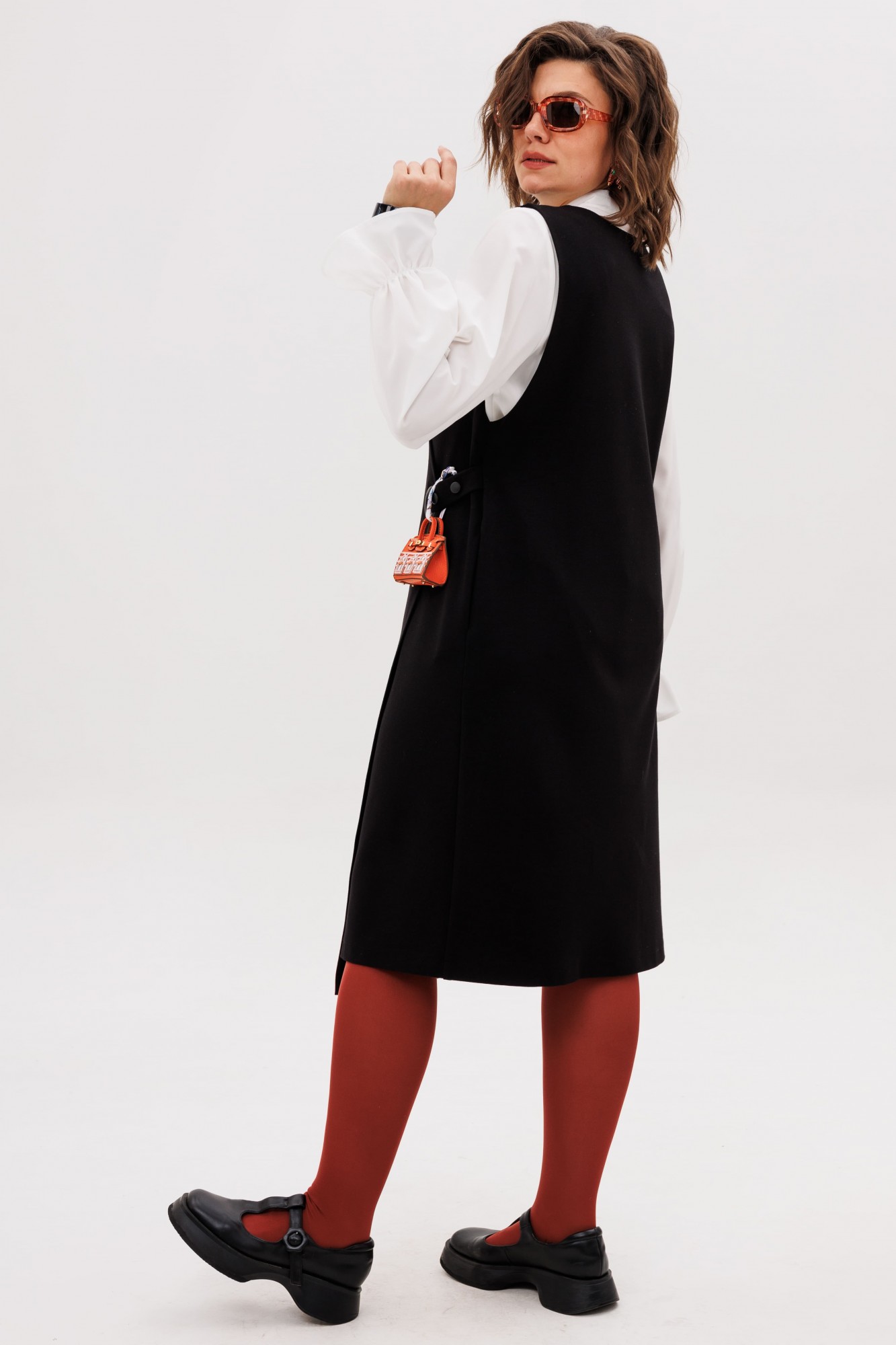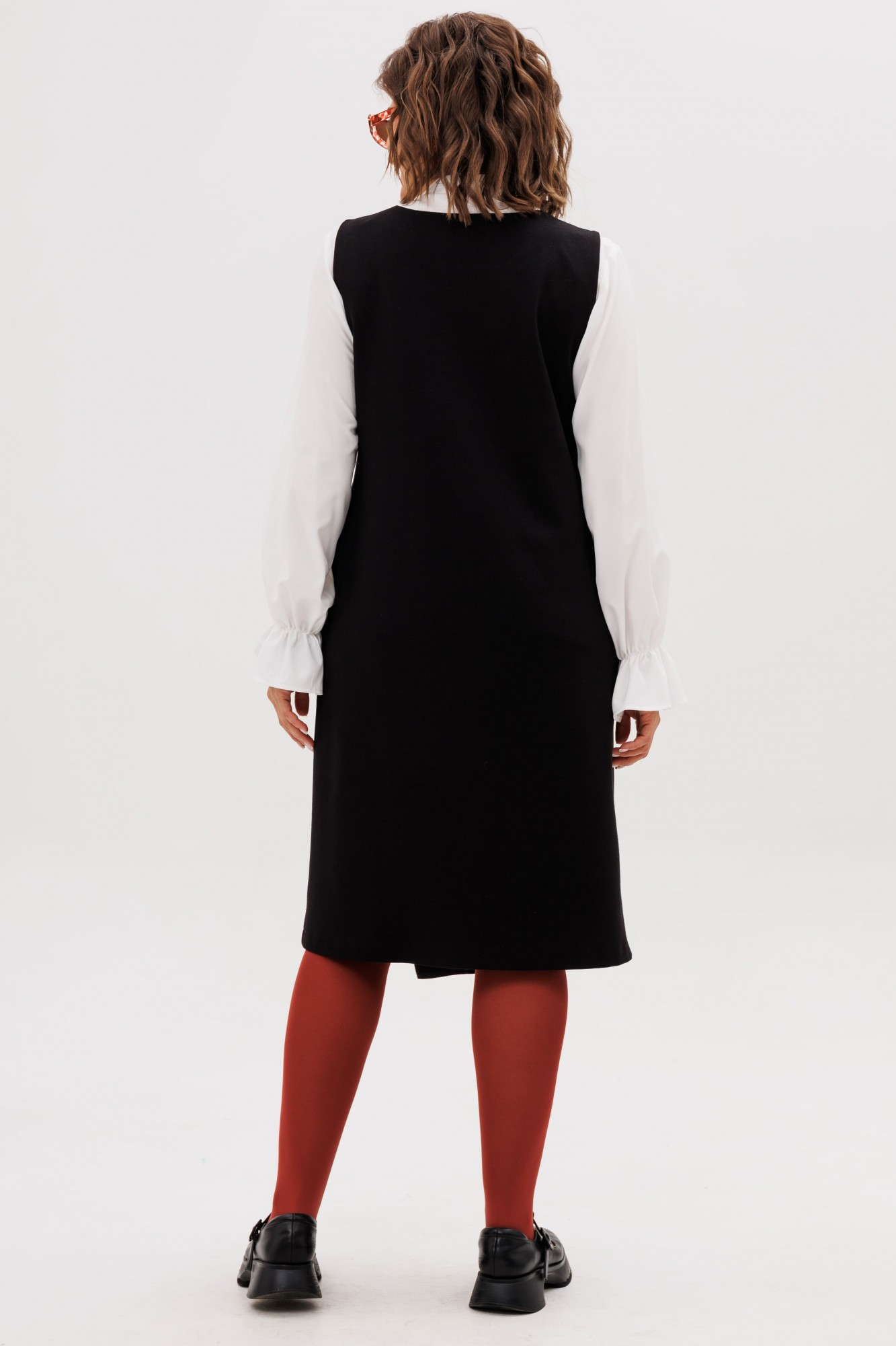 Этот сарафан, выдержанный в строгом прямом силуэте, становится идеальной основой для современного гардероба. Его лаконичную геометрию мягко нарушает игра асимметрии — динамичный, неровный край низа плавно скользит по фигуре, создавая ощущение движения и художественной небрежности. Глубокий V-образный вырез горловины не только зрительно вытягивает шею, но и привносит ноту женственности и открытости, служа идеальным фоном для любимой блузки или тонкого джемпера.