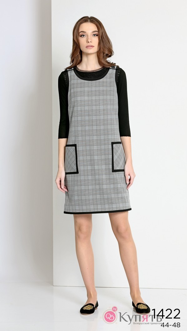 Комплект состоит из блузки и сарафана. Сарафан на стрейчевой подкладке выполнен из ткани в клетку, по переду накладные карманы, сарафан без молнии. Блузка выполнена из трикотажного полотна с отделкой из мелкой сетки, рукав 3/4.