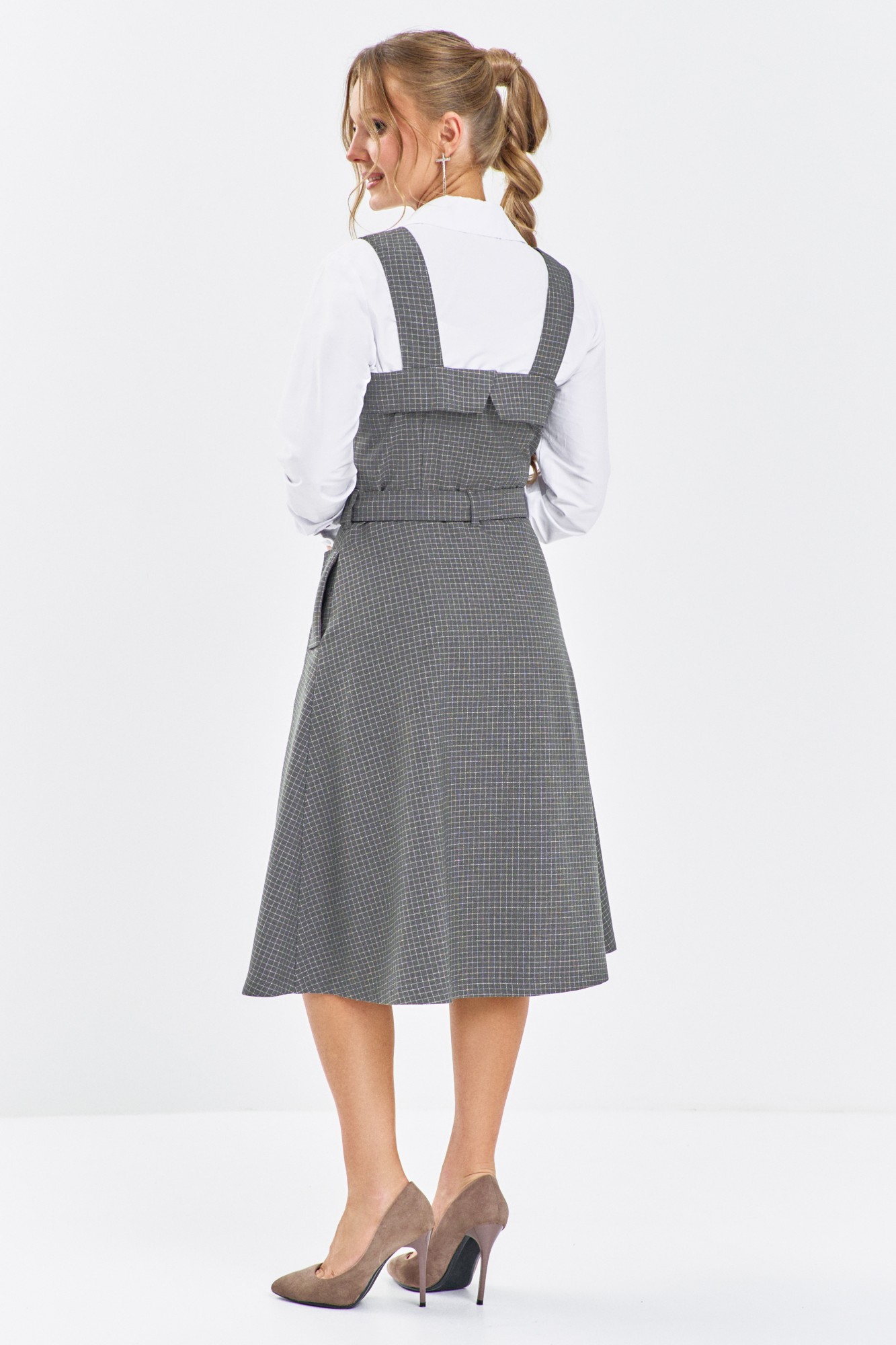 Сарафан женский выполнен из плательной ткани, изделие приталенного кроя, отрезное по линии талии. Сарафан на широких бретелях, по лифу изделия расположены отложные лацканы. Юбка трапециобразная , в боковых швах расположены карманы с клапаном. Сарафан двубортный с застежкой кнопки, в комплектации пояс из ткани основного изделия.