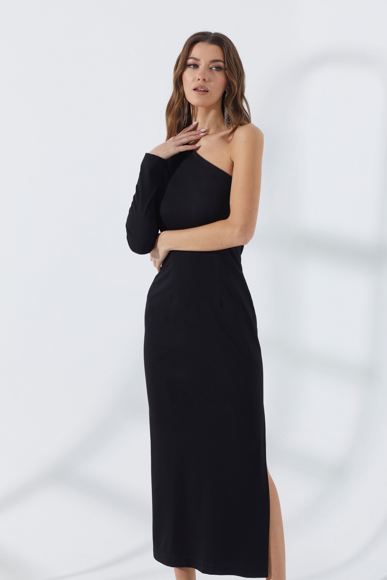 Нарядное платье прилегающего силуэта из трикотажа. Платье ассиметричное, с одним втачным длинным рукавом. По переду и спинке талиевые вытачки. По низу левой стороны платья длинный разрез.