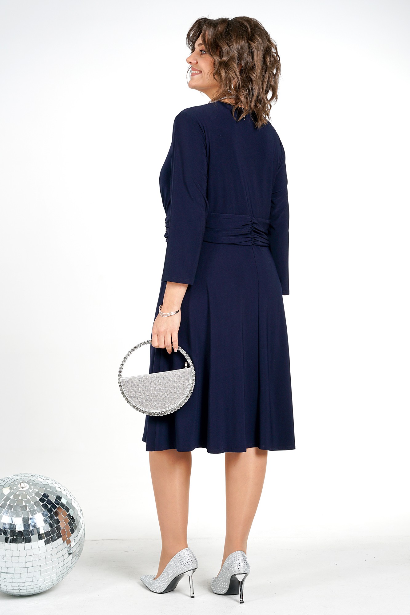 Платье полуприлегающего верху силуэта с расширением книзу, отрезное по линии талии, с притачным задрапированным поясом, по переду декорированный пришивным украшением. Лиф на подкладке. Перед лифа на запах по линии талии со сборкой. Передняя часть юбки с отлетной деталью фигурной формы. Рукава втачные, одношовные, длиной ¾.