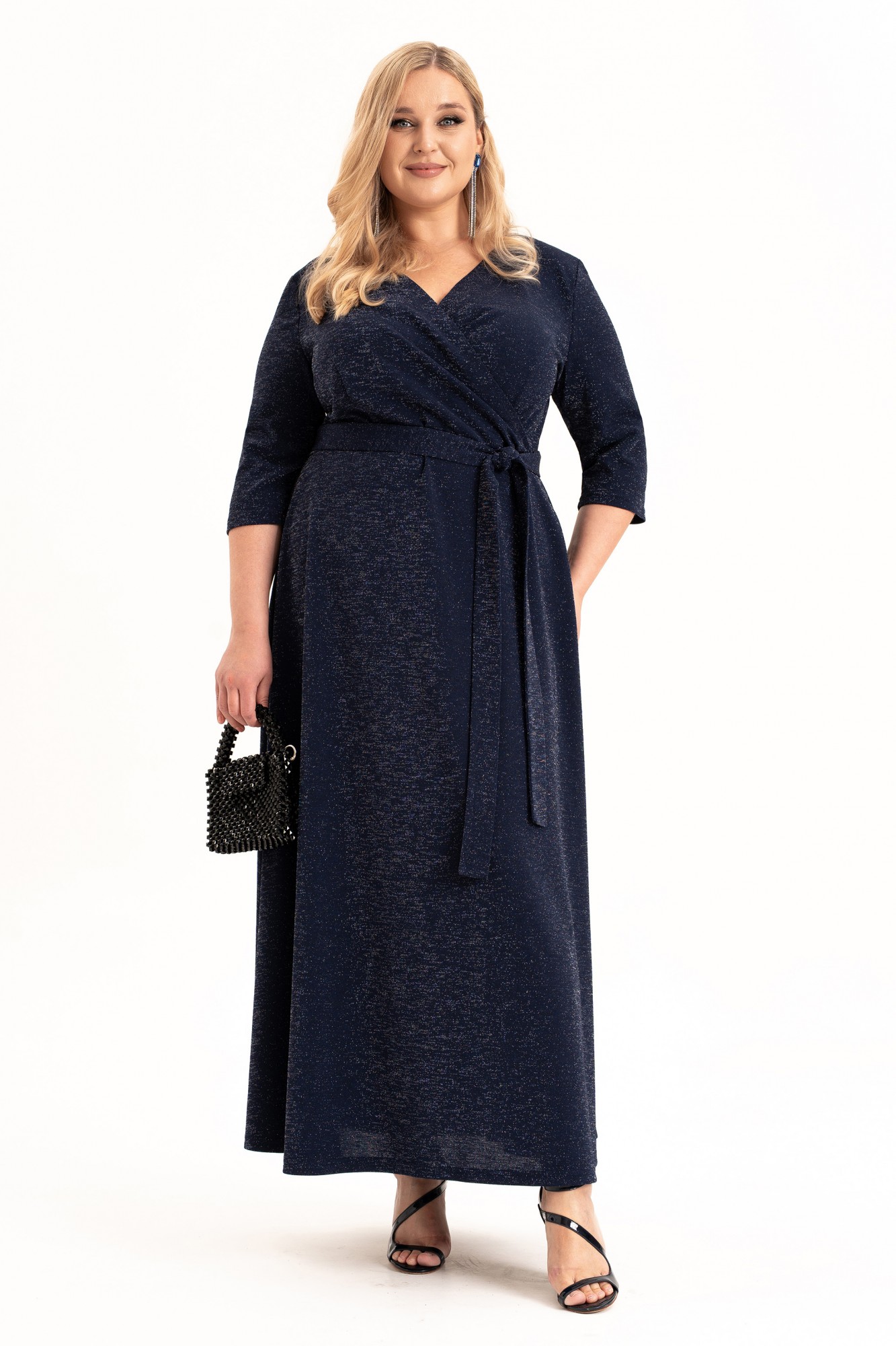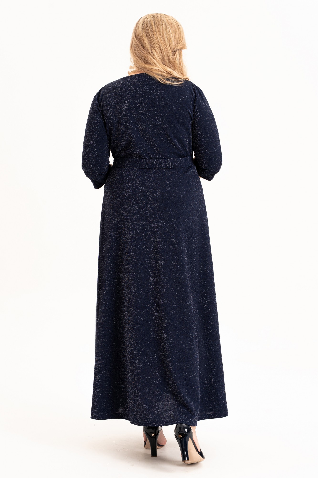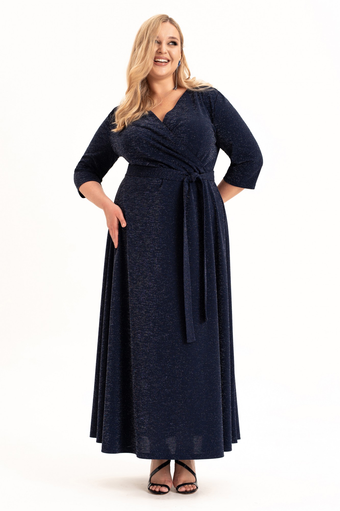 Нарядное платье на запах - это элегантный выбор для любой женщины, подростка или девушки, идеальное сочетание стиля и комфорта. Длинное вечернее платье синего цвета из стрейчевого трикотажного полотна с люрексом. Ткань мягкая, очень приятная к телу. Верхняя часть платья переда и спинки отрезные по линии талии. Лиф переда с эффектным запахом и рельефным бочком. Нижняя часть платья расширена к низу. Рукав втачной, длиной ¾. Платье со съёмным поясом. Съемный пояс и закрытые плечи выгодно подчеркивают женственность фигуры, а рукава длиной три четверти и пикантный V-образный вырез добавляют неповторимости вашему образу. Выполненное из премиальной ткани с блеском, платье представлено в различных размерах. Это универсальное платье подойдет для любого случая: будь то деловая встреча, вечерняя прогулка или особенный праздник. Тренд сезона 2025-2026года. Его можно носить в любое время года, от весны до зимы. Внимание к деталям и трендовый дизайн делают его идеальным выбором для множества мероприятий, включая свадебные фотосессии, ресторанные посиделки или корпоративные вечера. Платье нарядно, кокетливо и подходит как высоким, так и невысоким девушкам. Независимо от вашего стиля или сезона, наше платье будет идеальным выбором.