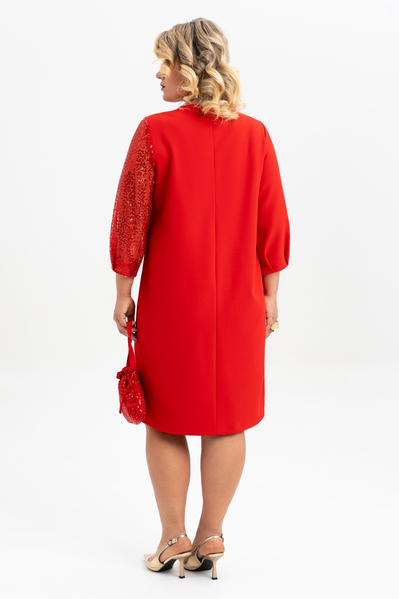 Нарядное платье больших размеров от бренда Альгранда представляет собой идеальный выбор для тех, кто ищет праздничный наряд с уникальным дизайном и комфортом. Шикарное нарядное платье с ассиметричными рукавами станет красивым дополнением элегантного женственного образа. Прямой крой платья- футляр подчеркнёт Вашу фигуру, делая её ещё более привлекательной. Оно выполнена из плательной ткани и сетки расшитой пайетками. Длина изделия доходит до середины голени, приоткрывая линию ног. Благодаря такой особенности дизайна платье будет хорошо смотреться в сочетании с обувью на каблуке и на низком ходу. По переду платья есть нагрудные выточка от проймы, фигурная кокетка, небольшой разрез в боковом шве. Спинка платья со средним швом, в который вставляется молния. Вырез горловины круглый. Воздушный втачной рукав длиной 3/4, по низу которого есть складки. Подойдёт для посещения деловых мероприятий и торжественных событий. В комплекте к платью прилагается нарядная сумочка. Эта маленькая сумочка придаёт завершённость образу. Выполненная в блестящем дизайне, она привлекает внимание и добавляет нотку роскоши. Наступает год Огненной Лошади и платье прямого кроя с сумочкой красного цвета принесет Вам удачу в следующем году!
