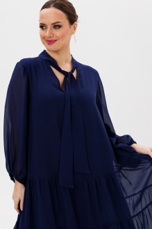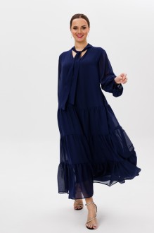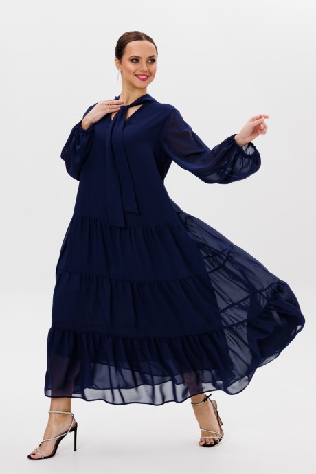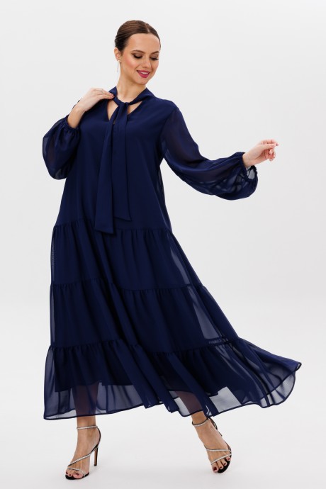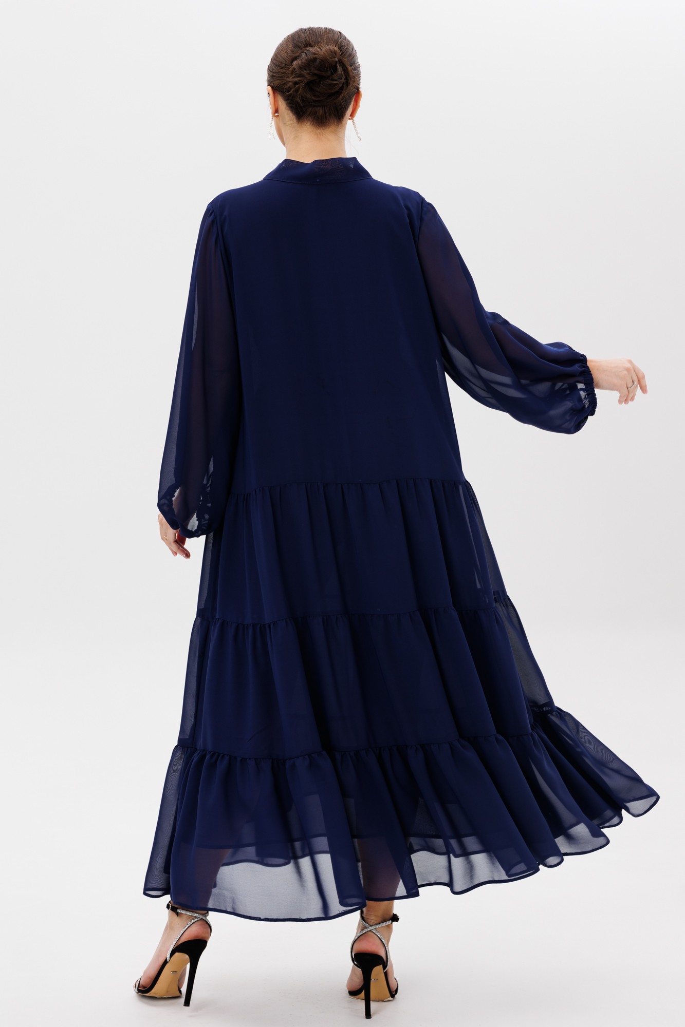 Вечернее платье макси из шифонового полотна на подкладке, трапециевидного силуэта — идеально для любого торжественного выхода и не только. Благодаря своей легкости и воздушности подойдет для разных образов. А благодаря своему крою идеально подойдет на любую фигуру. По горловине V-образный вырез и стойка переходящая в бант. Рукав расширенный к низу, на резинке, фигурный. По полочке и спинке идут 3 присобранных волана.