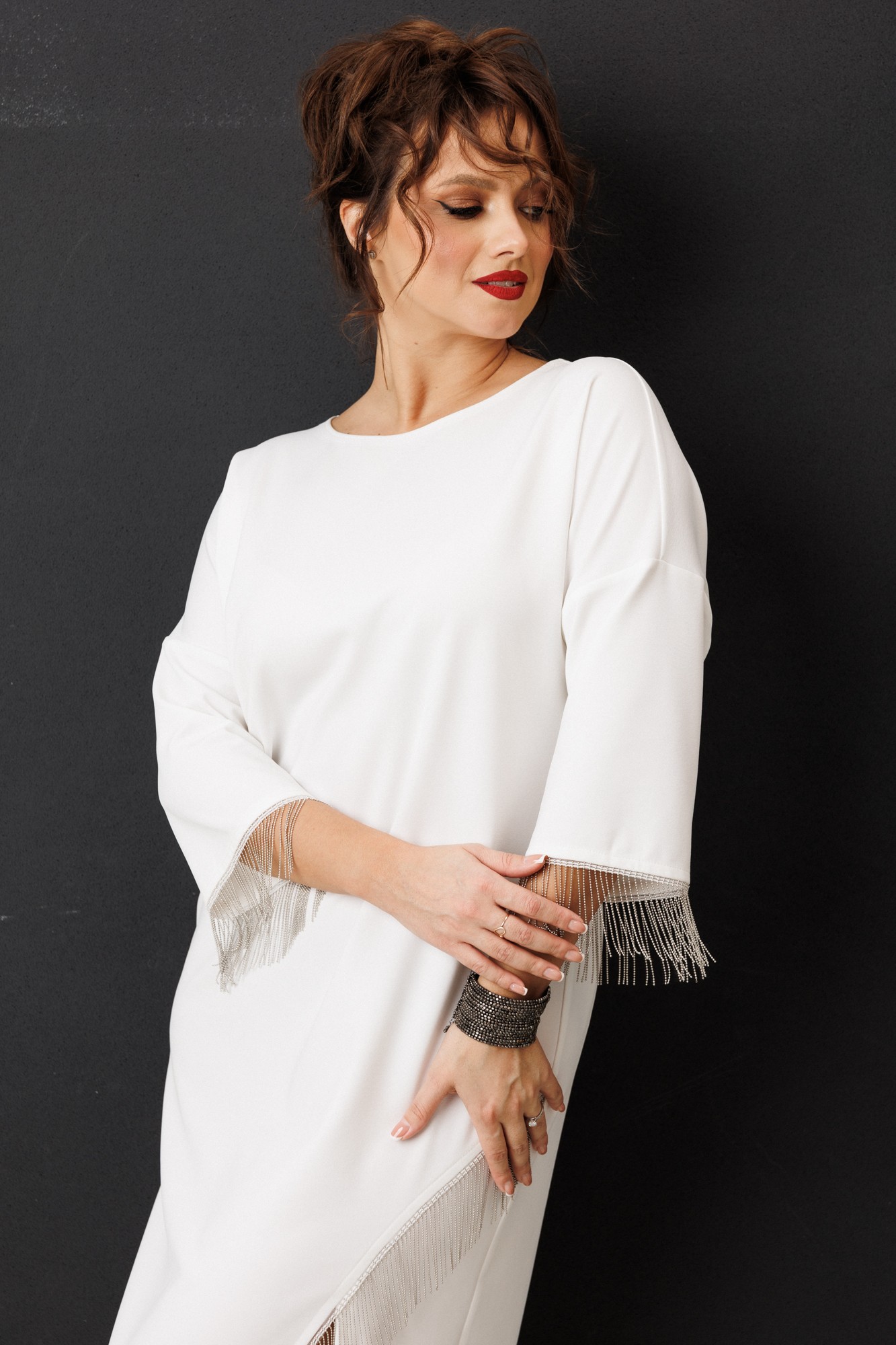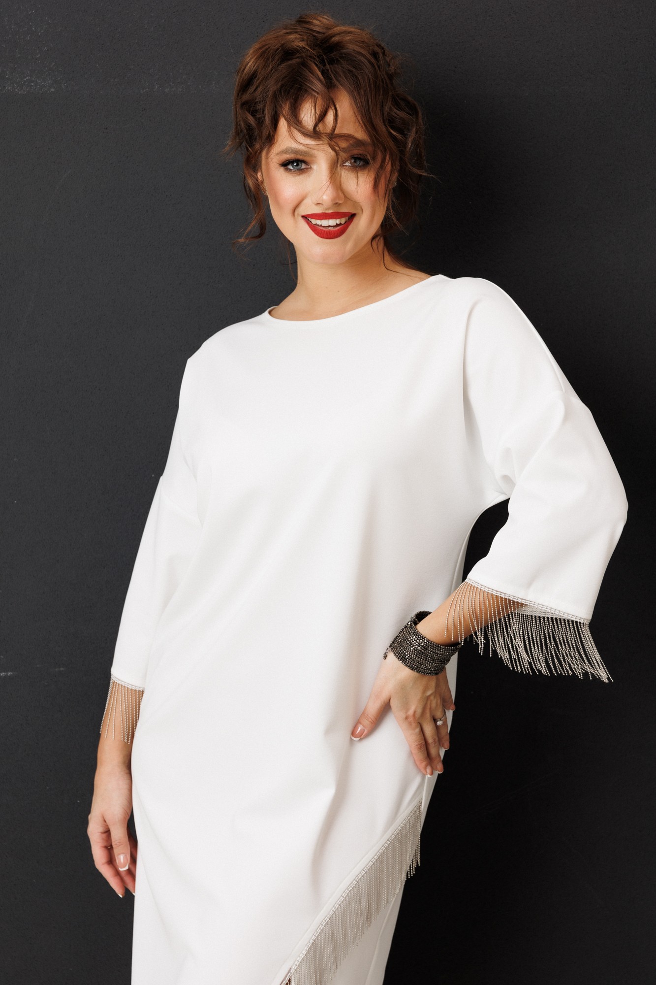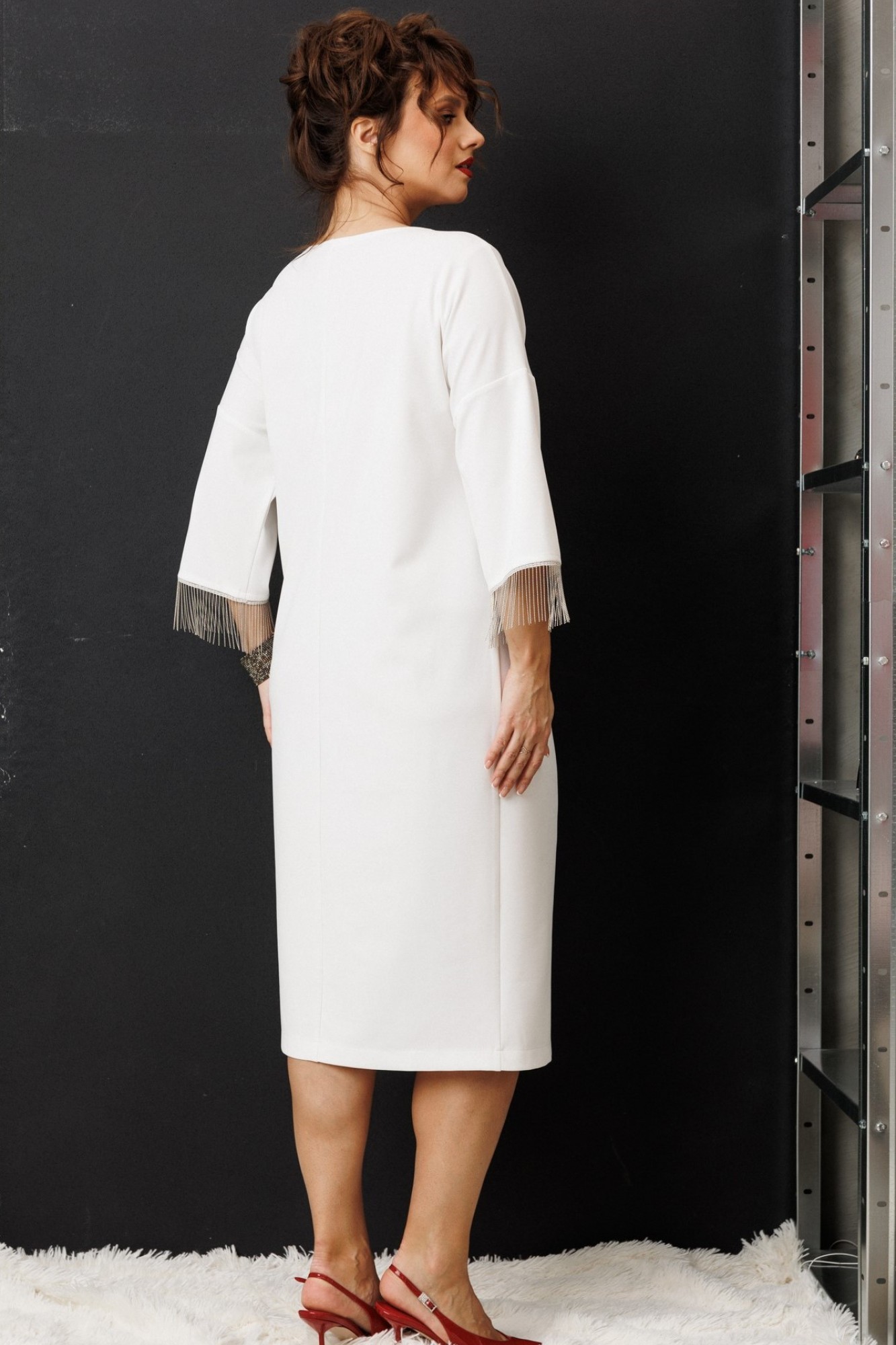 Платье миди — не просто одежда, это заявление о вашем стиле и вкусе. Элегантное праздничное платье прямого силуэта из трикотажного полотна. Ткань не мнется. Благодаря своему крою подойдёт для разных типов фигуры. Оно подчеркнёт вашу индивидуальность и станет отличным дополнением к вашему гардеробу. В нём вы будете чувствовать себя уверенно и комфортно, зная, что выглядите на все сто. Выбирая его, вы выбираете качество, комфорт и стиль. Классическое платье прямого силуэта, со спущенным плечом. По переду идет подрез с разрезом. В качестве декора по подрезу и низу рукава- металлизированная бахрома. По спинке идет средний шов. Такое платье незаменимая вещь в любом гардеробе.