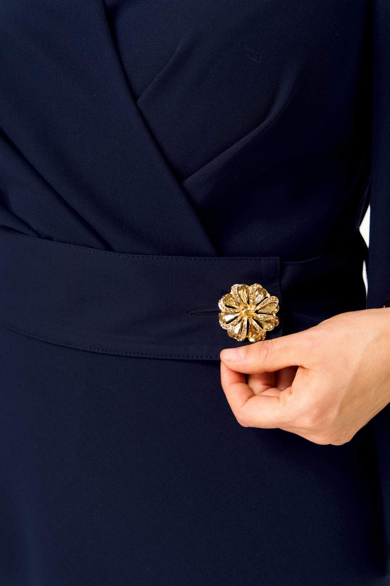Платье отрезное по линии талии. Полочка с имитацией запаха и складками по линии талии. Горловина V-образной формы. Спинка с талиевыми вытачками. Рукав втачной, объёмный к низу, с драпировкой. Юбка полуприлегающая по бедрам, свободная и широкая по низу. По боковым швам в области талии настрочены шлевки, через которые продет пояс, крепящийся на пуговицу.