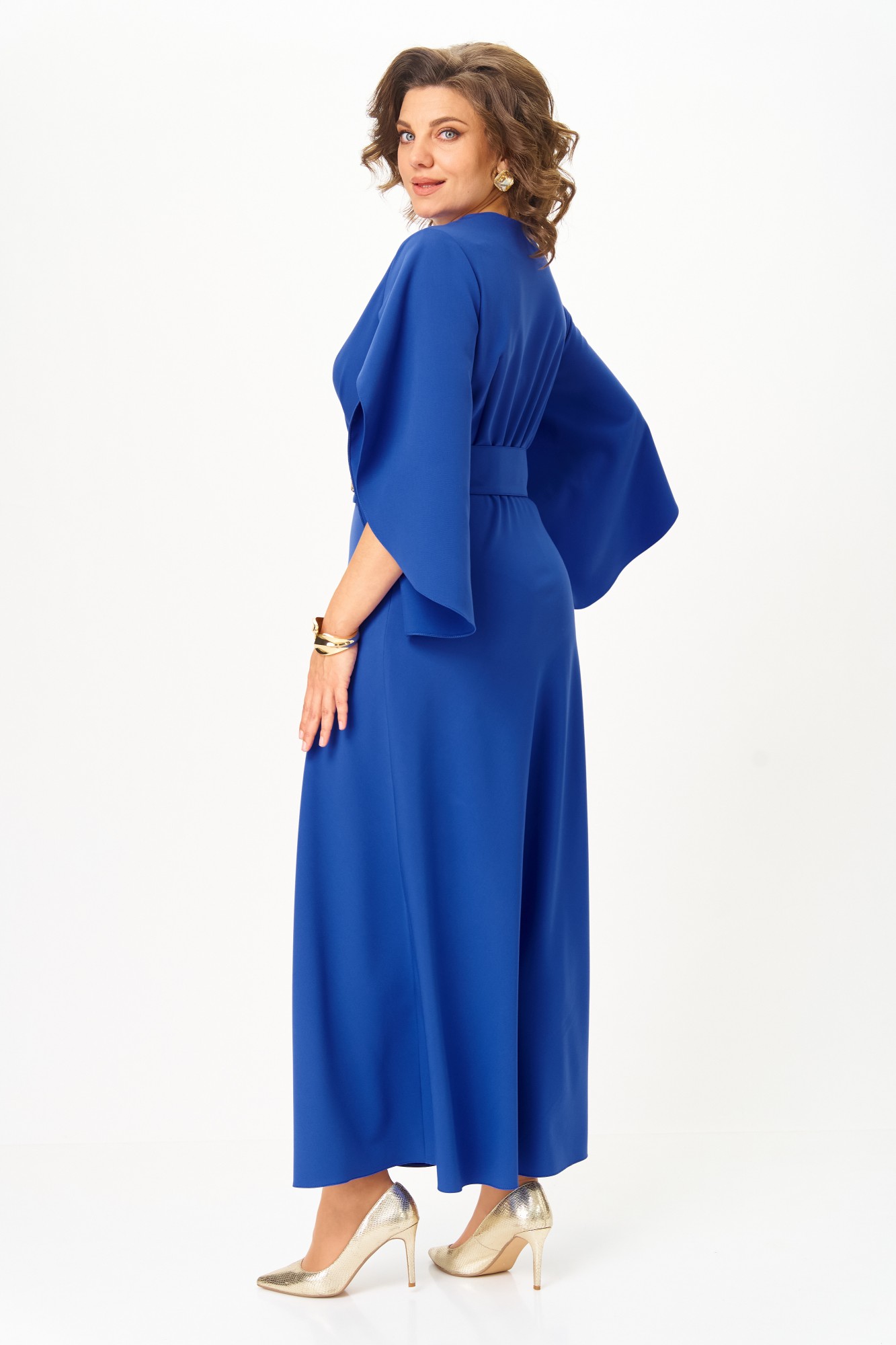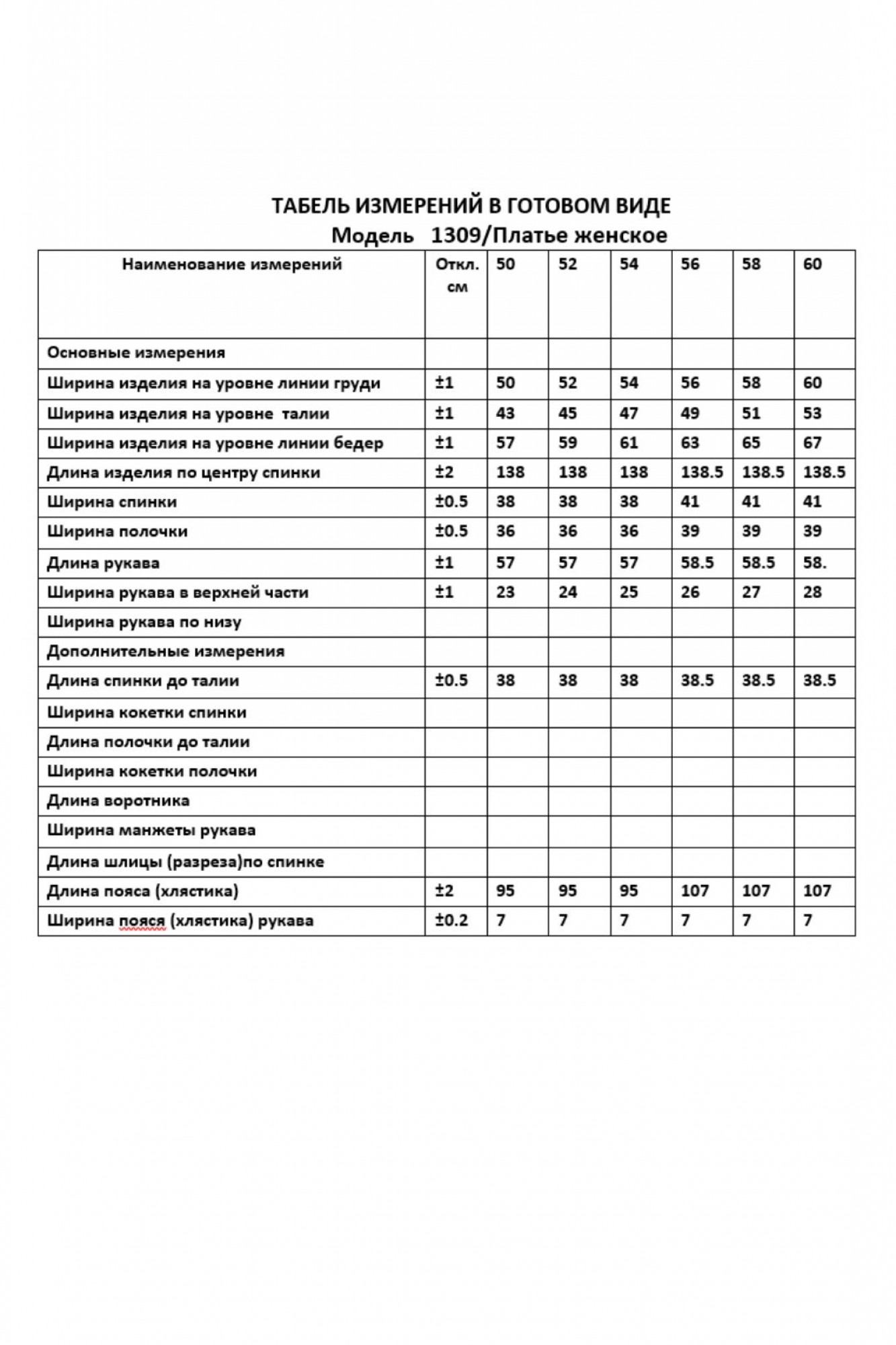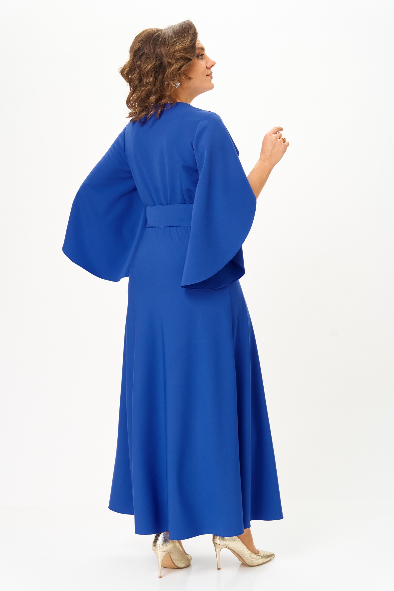 Платье отрезное по линии талии. Полочка с имитацией запаха и складками по линии талии. Горловина V-образной формы. Спинка с талиевыми вытачками. Рукав втачной, объёмный к низу, с драпировкой. Юбка полуприлегающая по бедрам, свободная и широкая по низу. По боковым швам в области талии настрочены шлевки, через которые продет пояс, крепящийся на пуговицу.