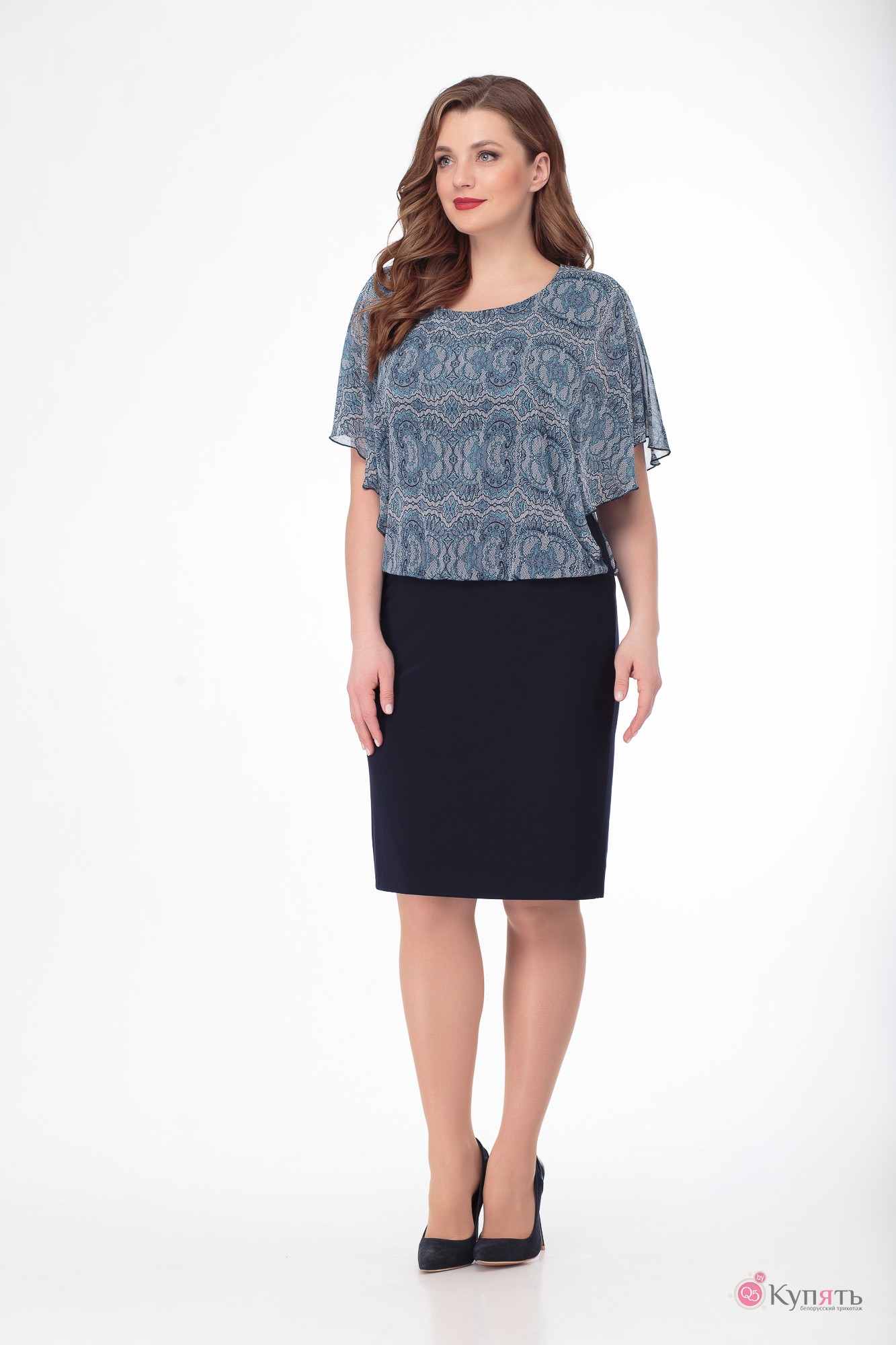 Женственное платье полуприлегающего силуэта, правильной длины до середины колена, из трикотажного полотна в сочетании с шифоном, платье на подкладке, верхняя часть лифа выполнена из шифона, более свободная по объему, мягко скрадывает недостатки фигуры, формирует изящный силуэт, воздушные цельнокроеные рукава-крылышки придают легкости образу, вырез горловины округлый.