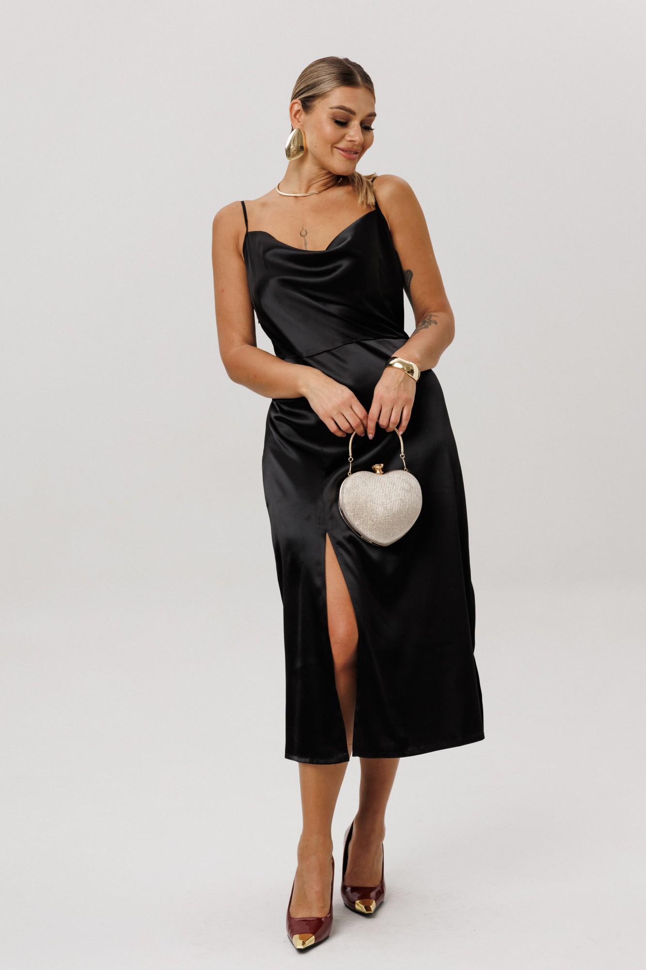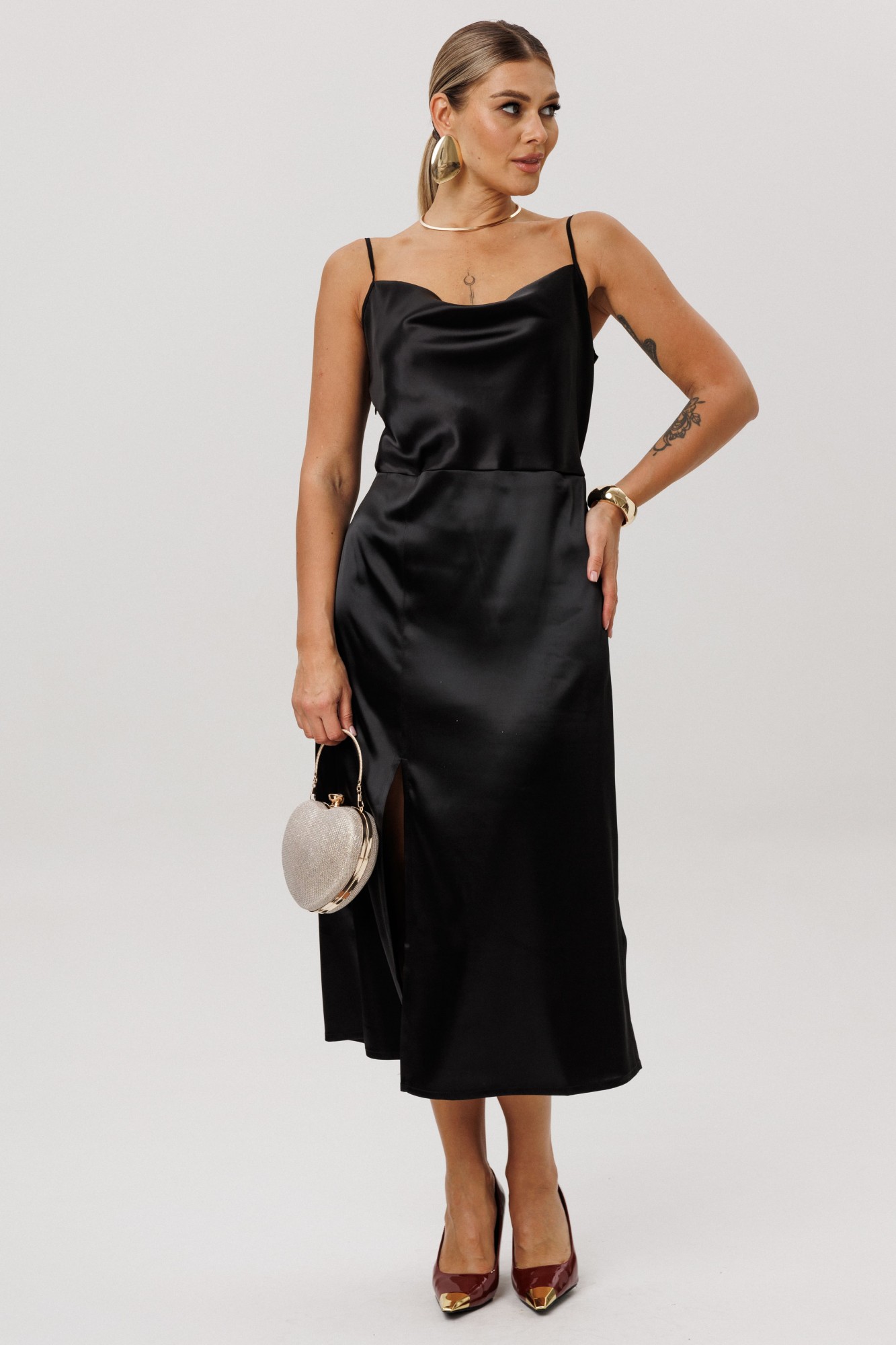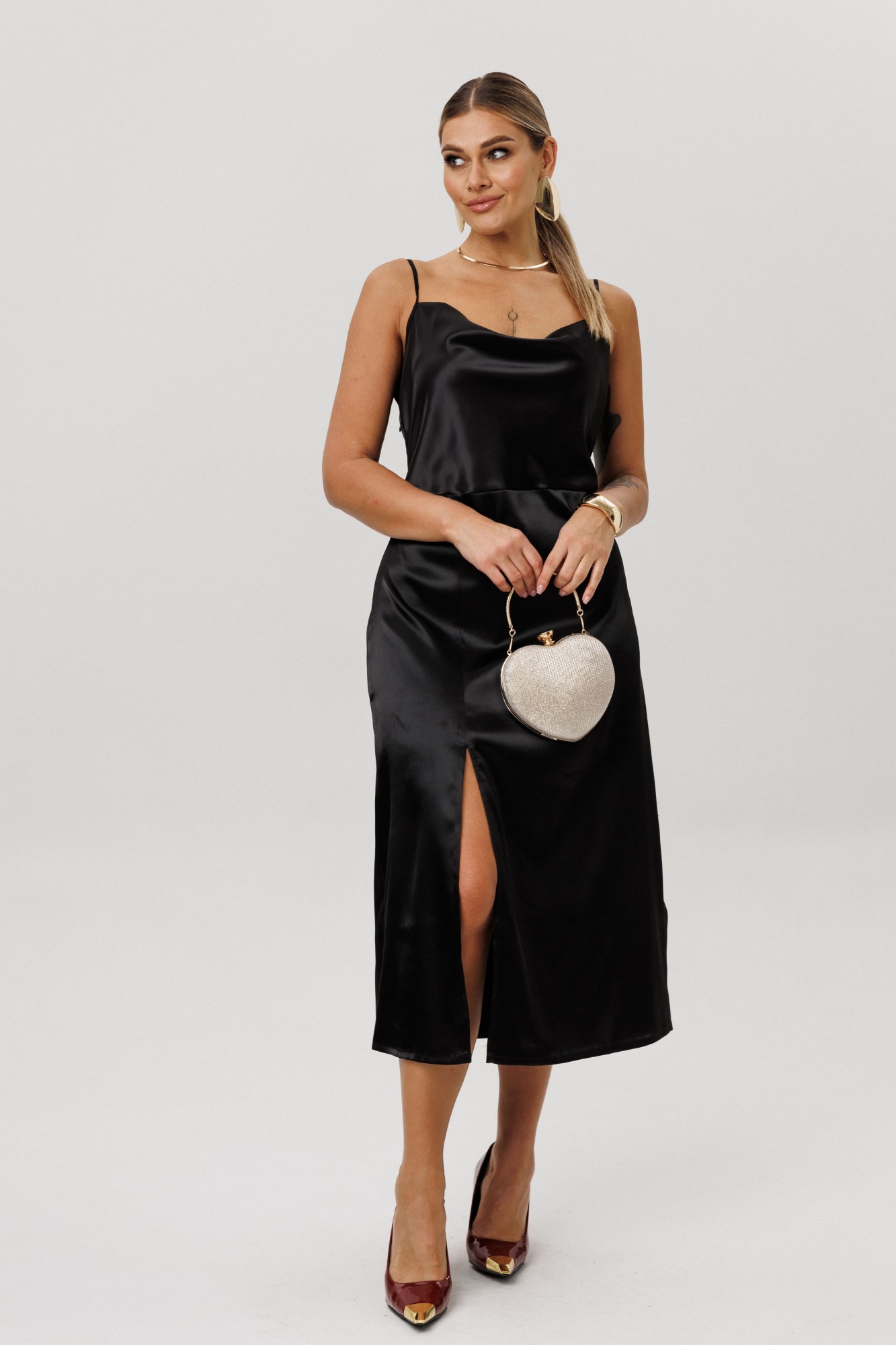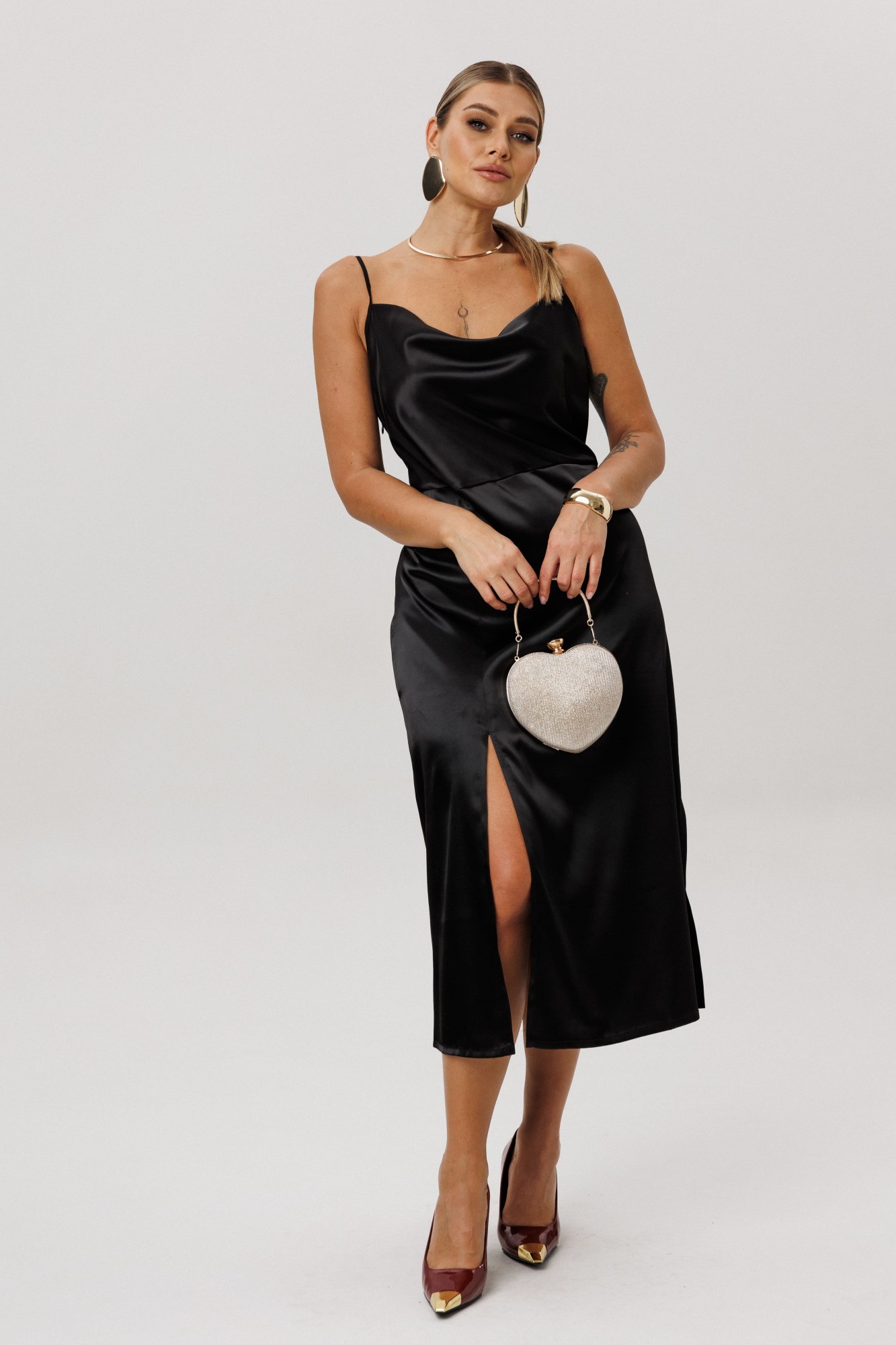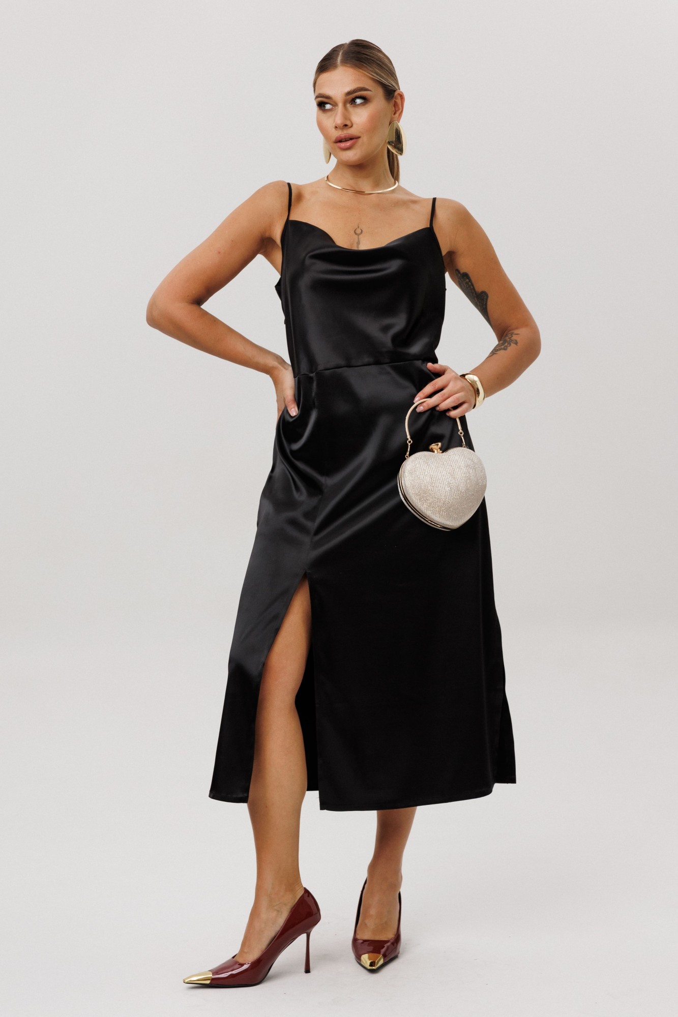 Платье актуальной во все времена длины миди с игривым разрезом изящно струится во время движения, приковывая взгляды. В правом боковом шве спрятана потайная молния. Вырез платья-качели нежно ниспадает, подчеркивая декольте и делая образ соблазнительным.