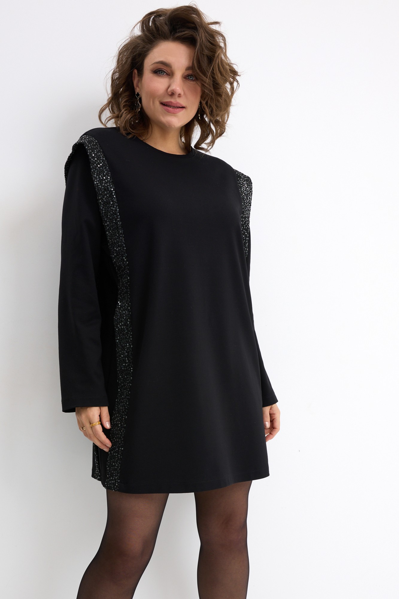 Почувствуйте себя неотразимой в этом современном чёрном платье свободного силуэта! Мягкая ткань, приятная к телу, обеспечит невероятный комфорт, а цельная декоративная планка из пайеток по передней и задней части создаёт дополнительную вертикаль, стройнит и притягивает взгляды окружающих мерцанием. Это платье создаёт идеальный баланс между расслабленностью и гламуром, позволяя Вам чувствовать себя уверенно и элегантно на любом мероприятии! Горловина изделия обработана обтачкой с открытым срезом. Рукав и низ изделия - подгибкой.