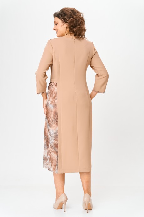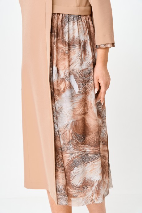 Элегантное женское платье, полуприлегающего силуэта. Горловина круглая, по переду и спинке рельефные швы, с левой стороны в швы вставлена планка, юбка от планки до планки выполнена из сетки на подкладке. Застежка на тесьму молния в среднем шве спинки. Рукава втачные, длина 3/4 , по низу рукава отделка из сетки. В комплект входит съемный цветок. Платье без подкладки.