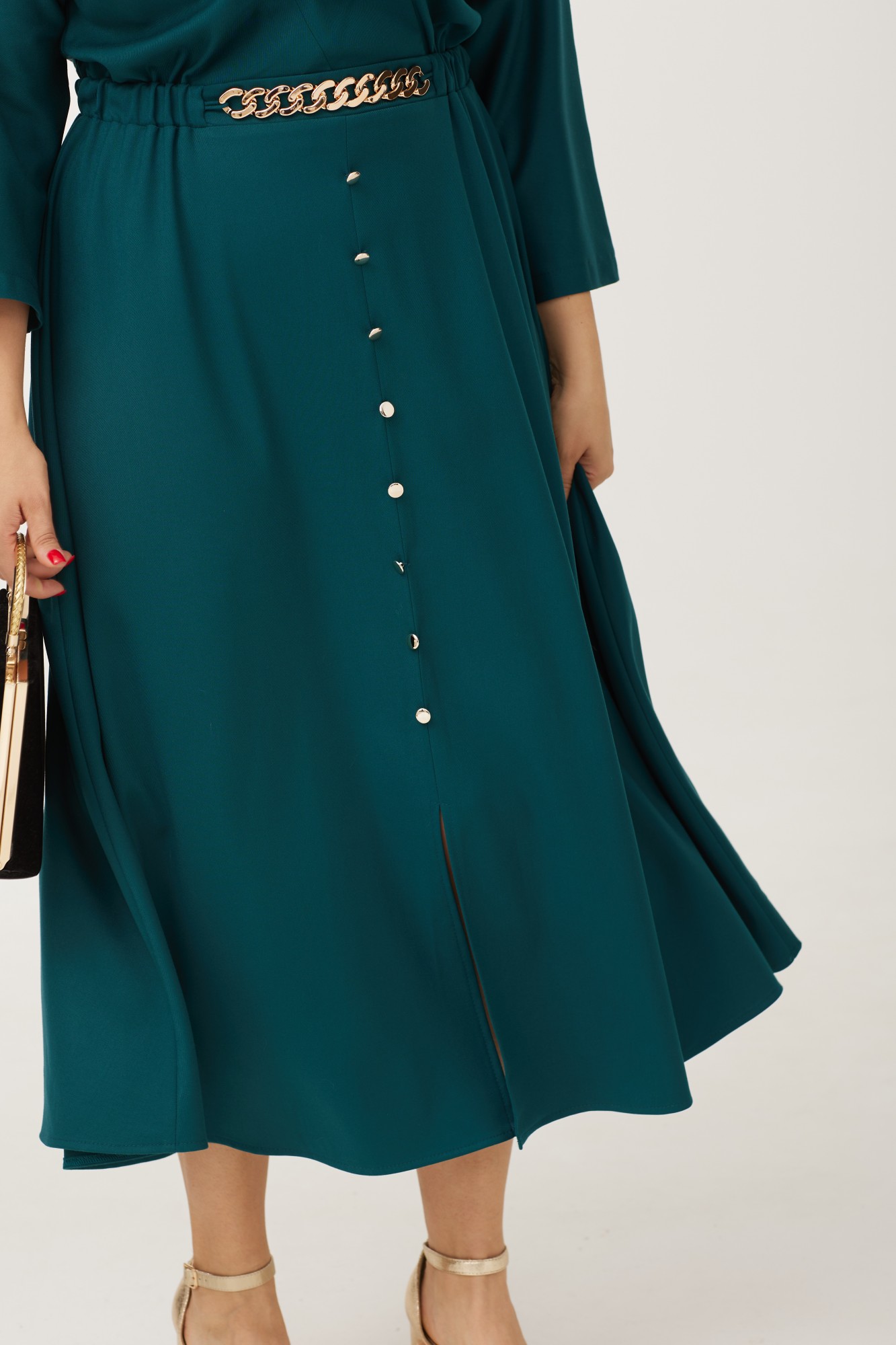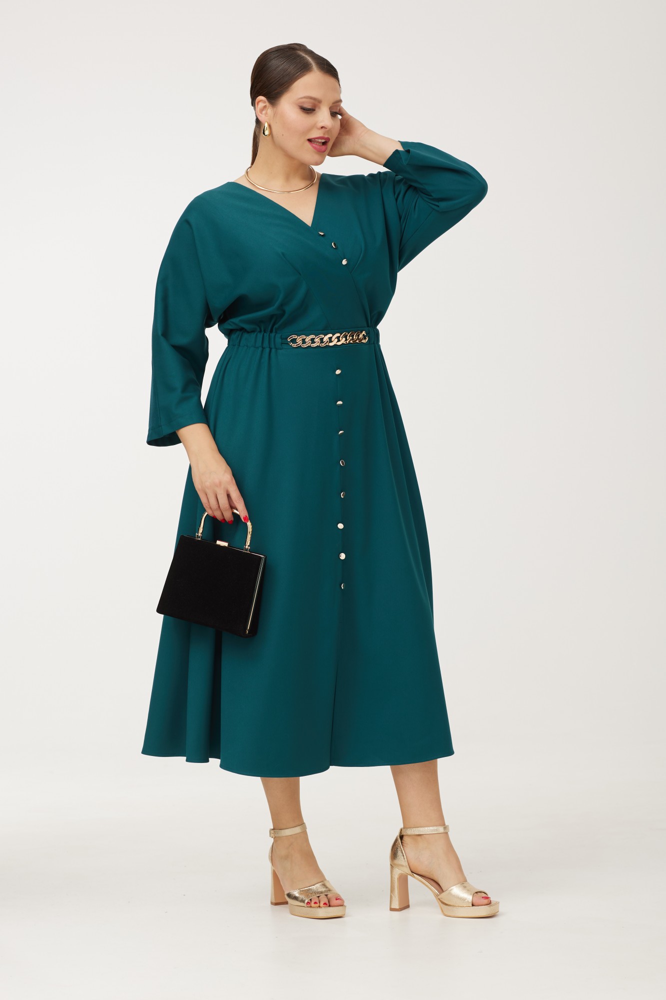 Женское платье призвано украшать женщину, подчеркивать фигуру, преображать весь образ прелестной дамы. Прежде всего, красивое платье — это символ женственности, нежности, именно платье вызывает чувство возвышенности, полета, легкости, свободы и сексуальности. Красивый женский наряд моментально привлекает к себе внимание мужчин. Наше идеальное платье для торжественных мероприятий и романтических прогулок. Платье длиной миди из качественной плательной ткани с вискозой в составе. Отрезное по линии талии .Смотрится очень выигрышно V-образная горловина. Это очень женственный вырез, с ровными линиями кроя, которые имитируют запах. Крой рукава «кимоно» делает платье очень привлекательным, рукав свободный. Платье отрезное по линии талии, частично на эластичной резинке с декоративным элементом в виде цепочки, которую при необходимости можно снять. Струящаяся юбка-полу солнце длиной ниже колена .По центру переда юбки для придания шарма выполнен разрез, выше декорированный пуговицами. Платье идеально садится на любой тип фигуры и стройнит ее . Удобный, свободный крой подарит Вам полную свободу движений и комфорт!