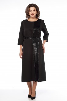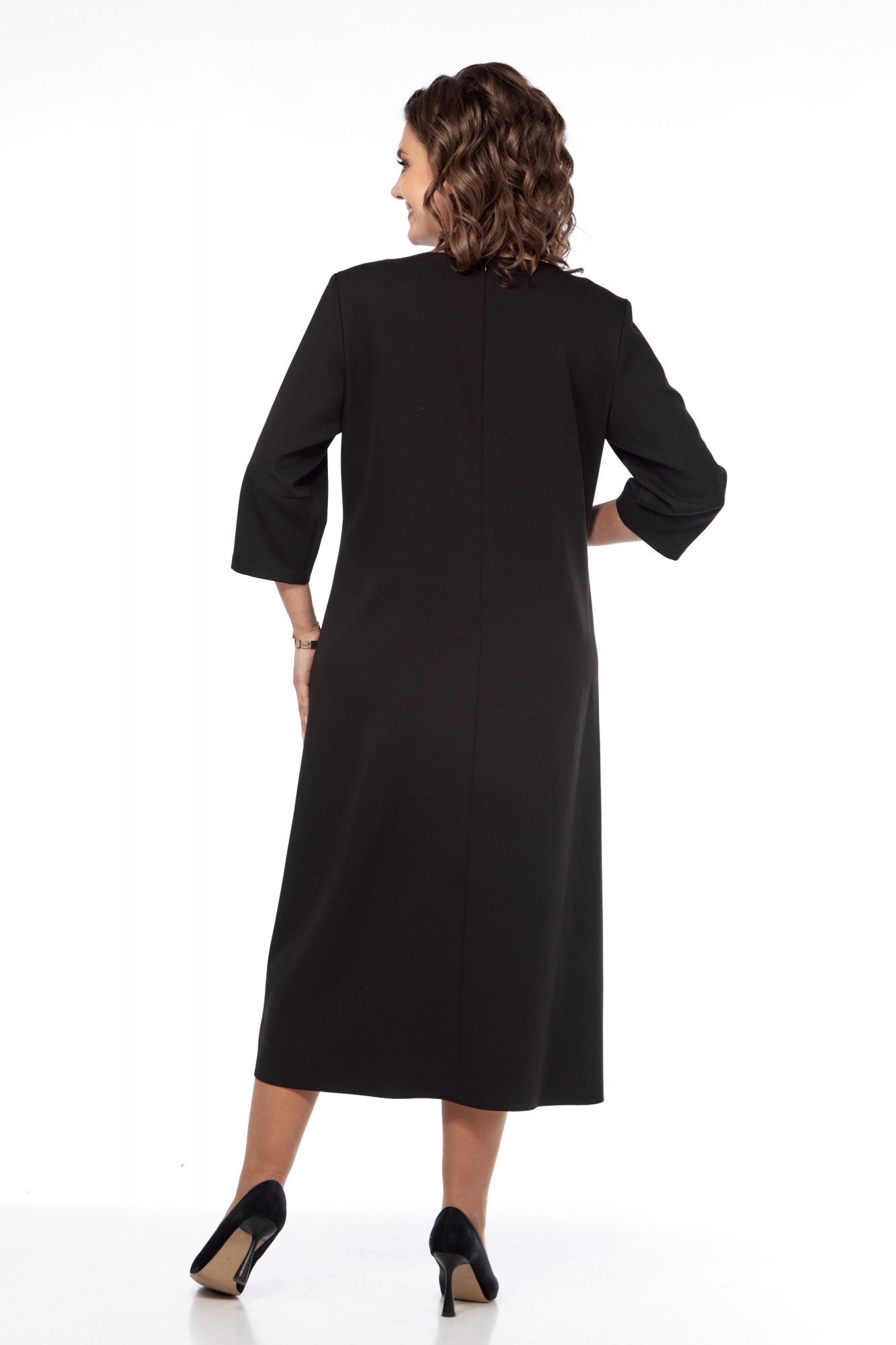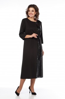 Платье женское полуприлегающего силуэта, слегка расклешённое к низу. Спинка со средним швом сверху и потайной молнией. Перед с вставкой из отделочной ткани в левой части платья. В области талии пояски, которые регулируют ширину отделочной детали. С правой стороны переда косая нагрудная вытачка . Рукав втачной, одношовный с локтевой вытачкой, длиной 3/4. Горловина округлой формы.