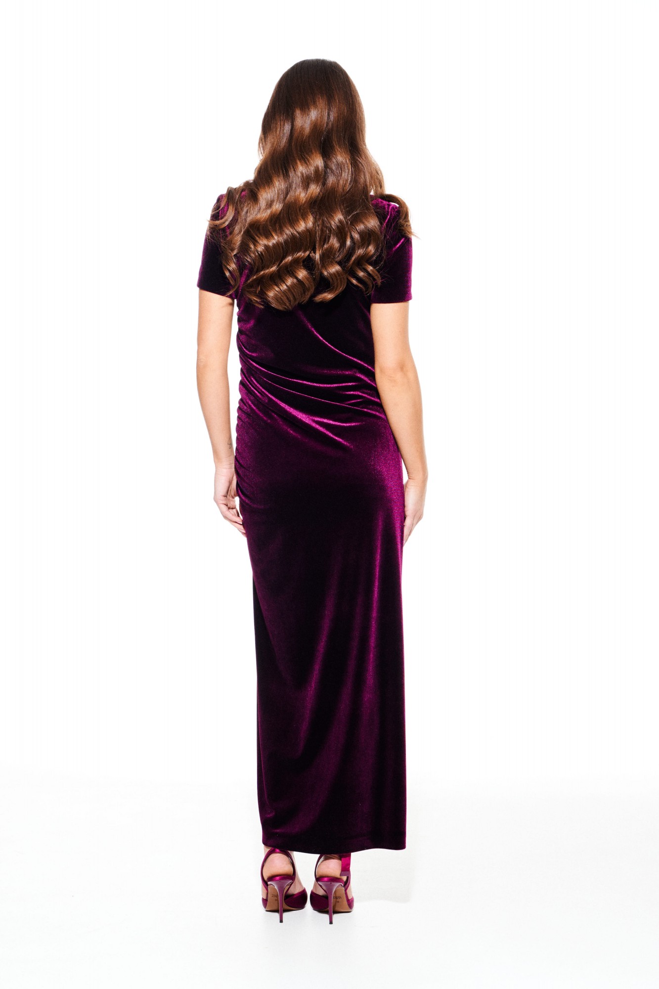 Платье из бархата на трикотажной основе, полуприлегающего силуэта, с фигурным вырезом горловины. По переду нагрудные вытачки, рельеф со сборкой на резинку и разрез. Спинка цельная. Рукав втачной, короткий. Длина платья до щиколотки.