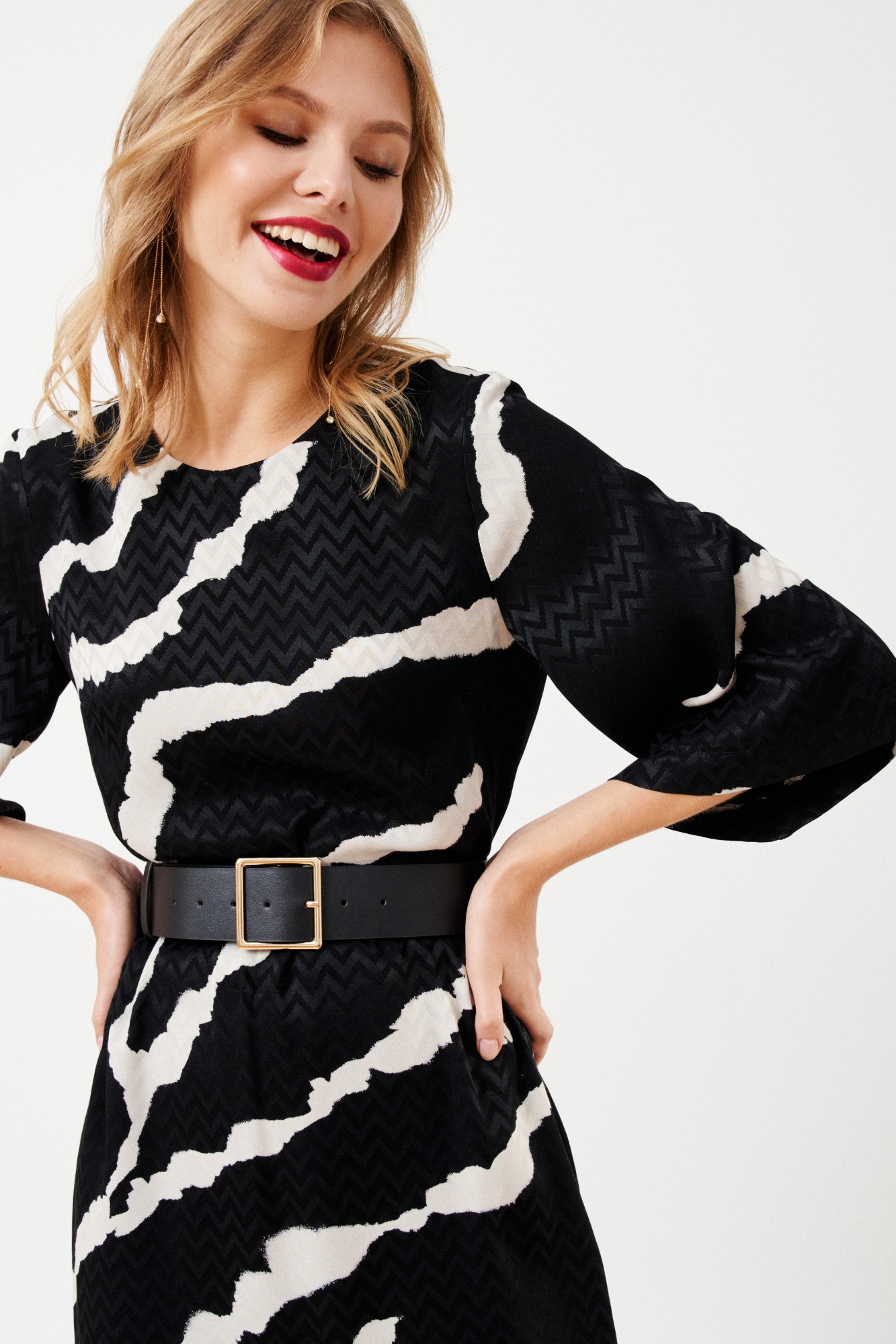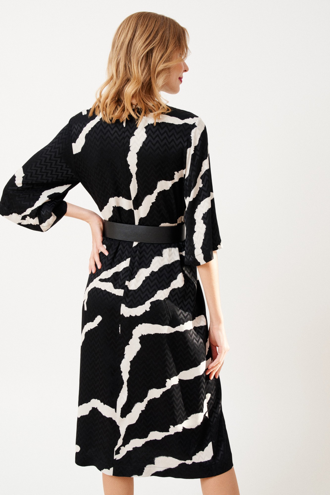 Платье женское, полуприлегающего силуэта, длиной ниже линии колен из костюмно-плательной ткани. Перед с нагрудными вытачками. В среднем шве спинки платья потайная застежка молния. Рукав одношовный, втачной, широкий, длиной до линии локтя. Вырез горловины круглый. В комплект входит декоративный съемный пояс.