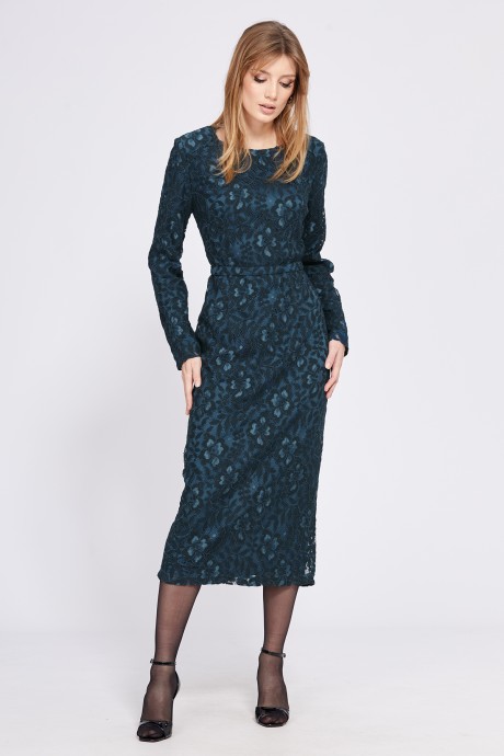Платье выполнено из гипюра. Платье приталенного силуэта длиной миди. В среднем шве спинки разрез и застежка на потайную молнию. Горловина округлой формы. Платье с плечевыми накладками. Рукав втачной, одношовный. Платье на отлетной по низу подкладке из атласа. В комплект входит пояс из основной ткани с застежкой на кнопки.