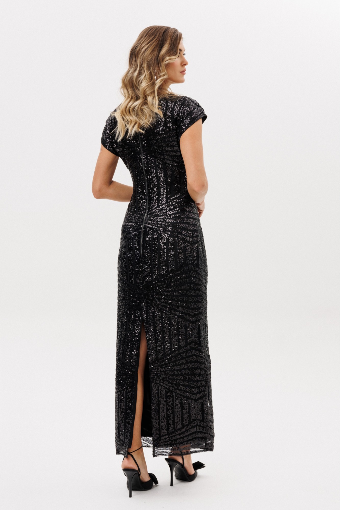 Платье выполнено из сетки с вышивкой с пайетками. В среднем шве спинки разрез и застежка на молнию с металлическими звеньями. Горловина и спинка выполнены в виде V-образной лодочки. Плечевой шов удлинен, образуя рукав цельнокроеного покроя. Платье на отлетной по низу подкладке.