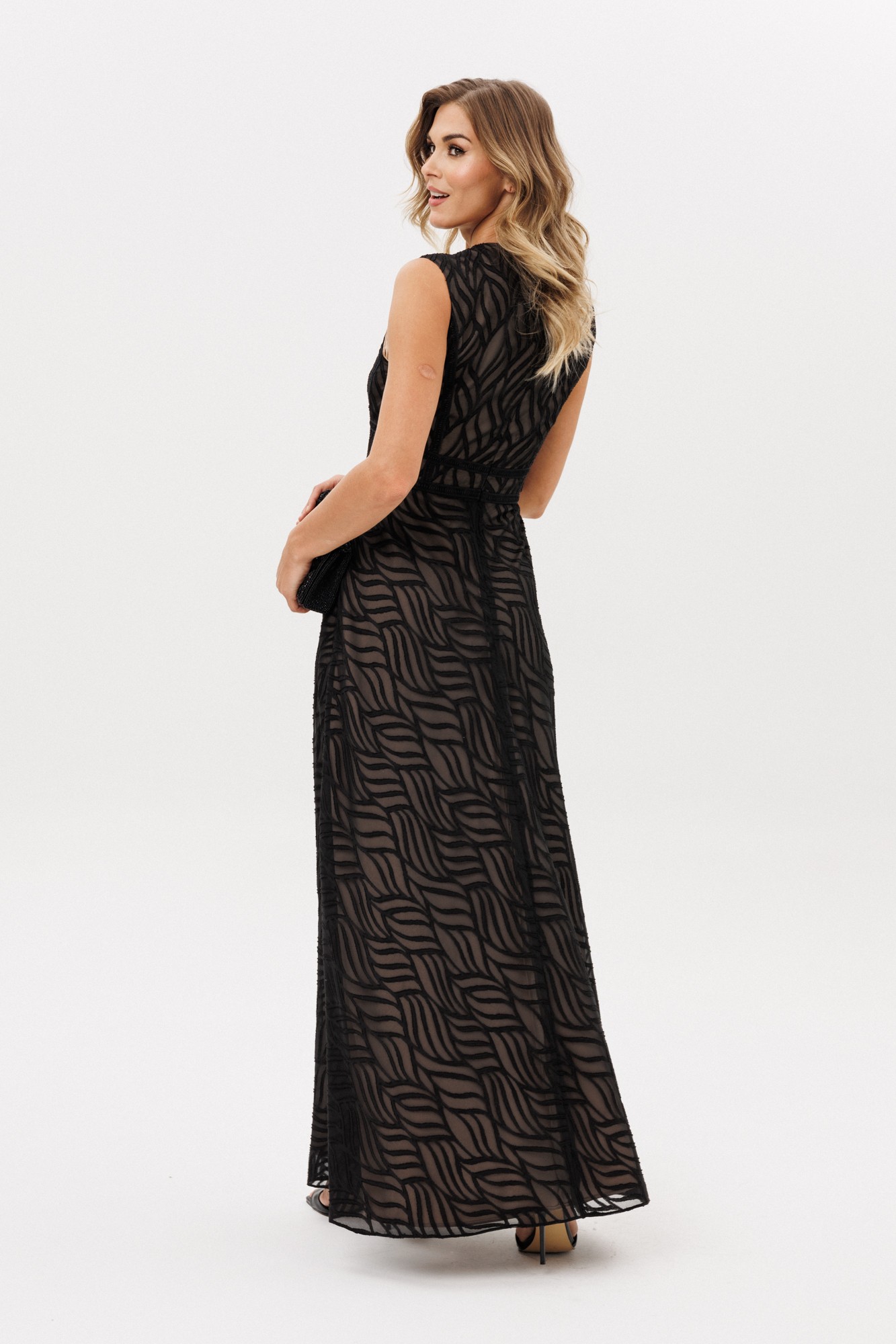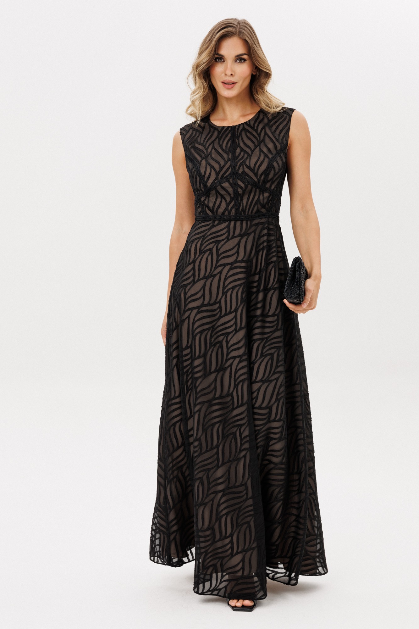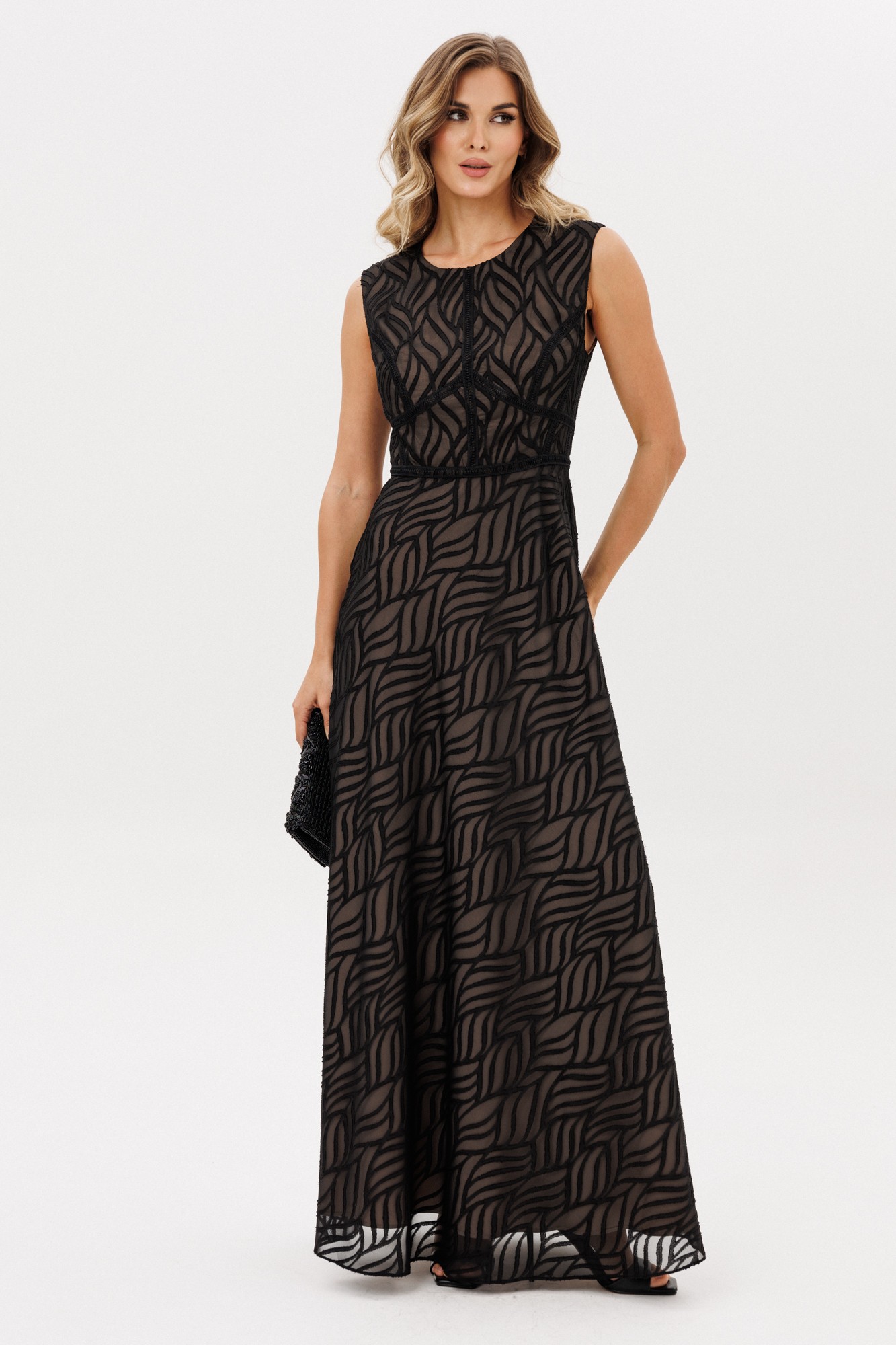 Платье выполнено из шифона с жаккардовым рисунком. Платье Х-образного силуэта, отрезное по линии талии, длиной миди. Спереди средний шов и горизонтальный подрез. Застежка на потайную молнию сзади в среднем шве спинки и юбки. Горловина округлой формы. Юбка расширена к низу и выкроена по косой. Платье декорировано надстрочной тесьмой по всем резным линиям лифа и линии талии. Платье на отлетной по низу подкладке телесного цвета.